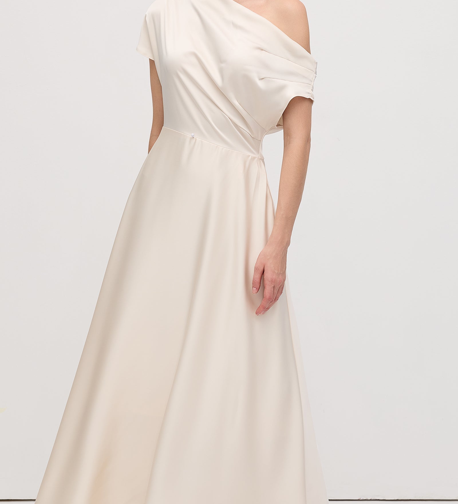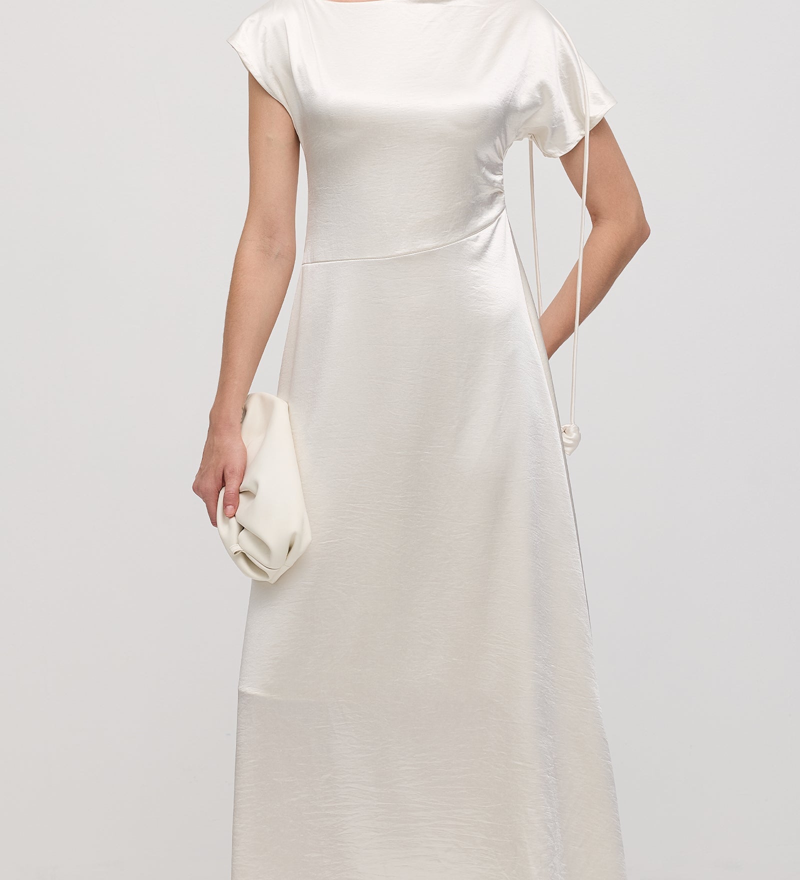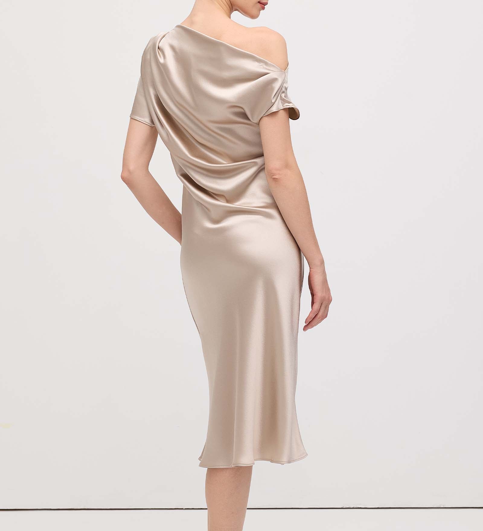 Asümmeetriline satiinist midi kleit lühikeste varrukatega