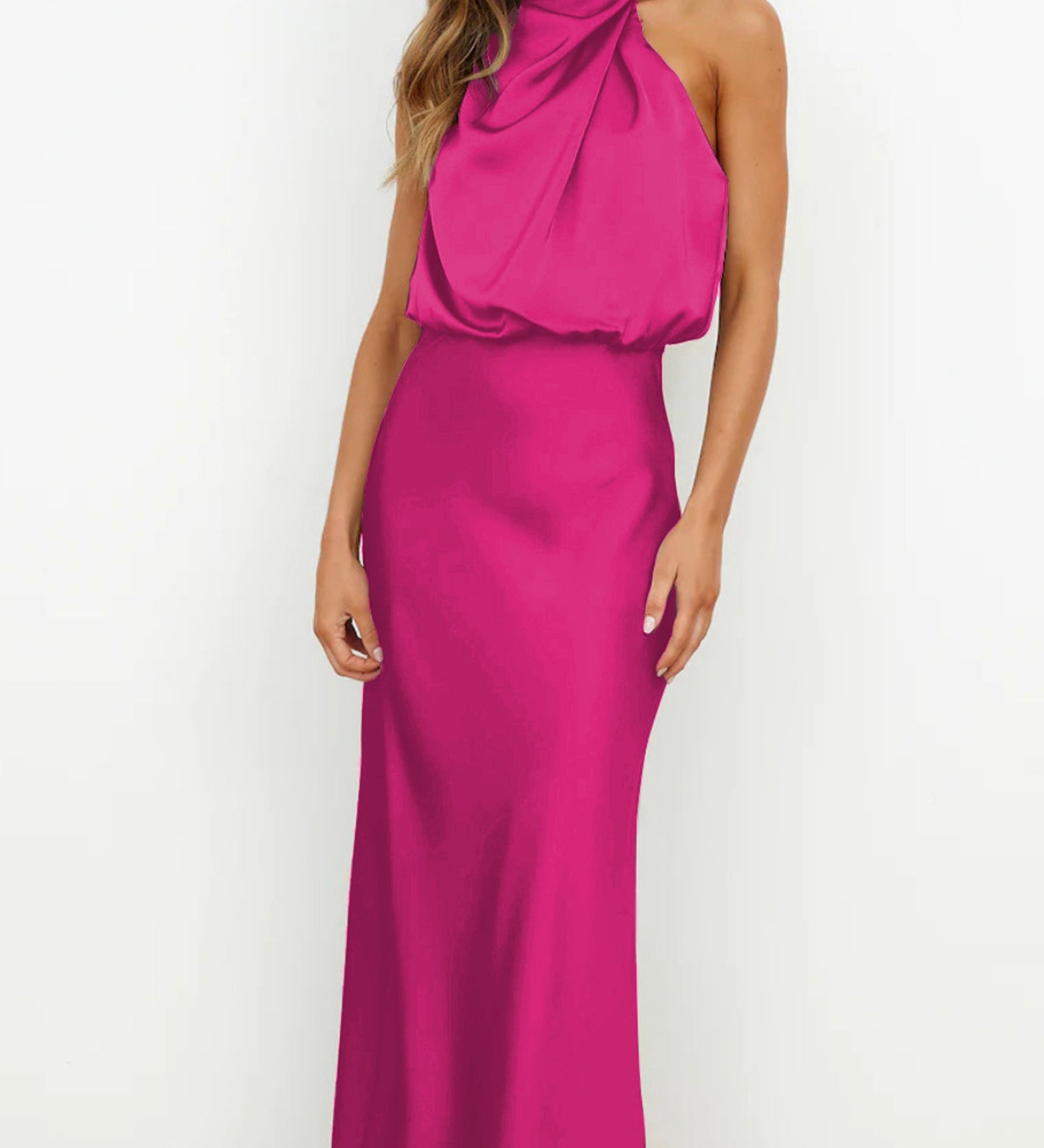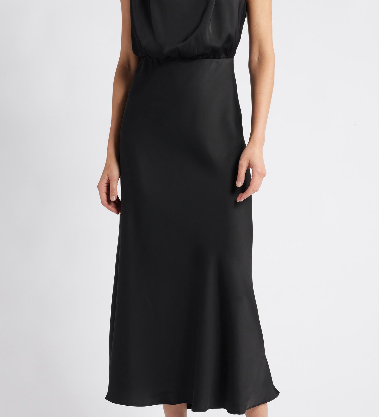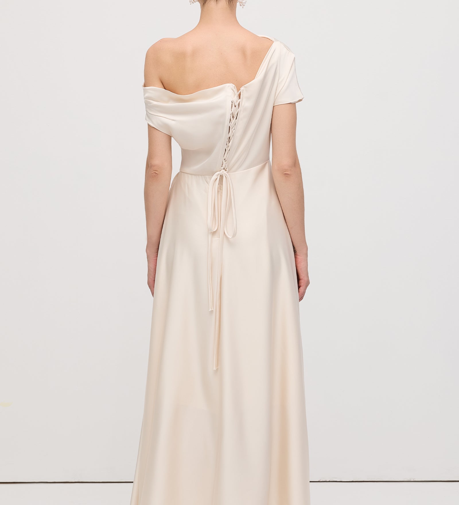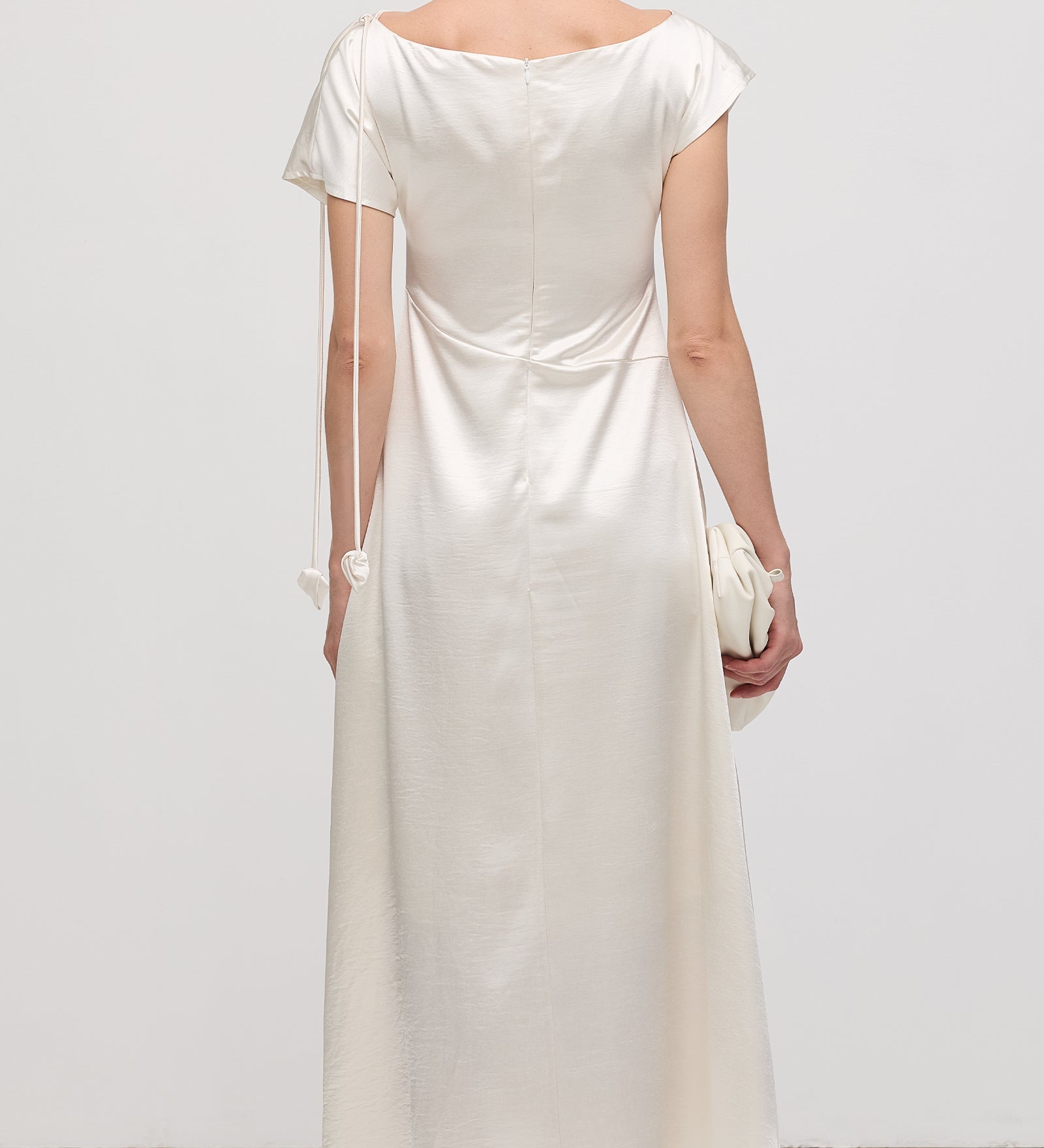 Asümmeetriline satiinist midi kleit lühikeste varrukatega