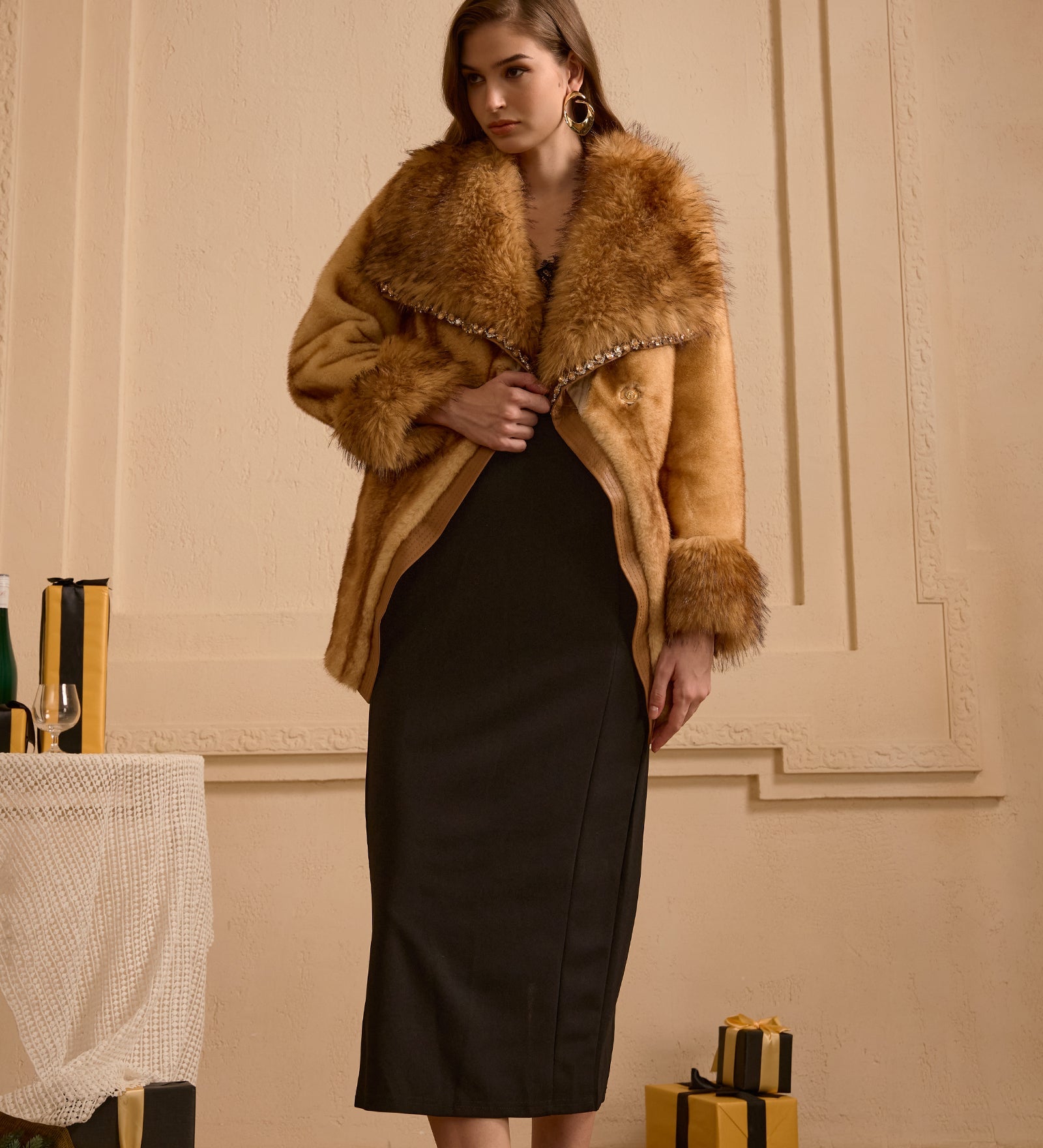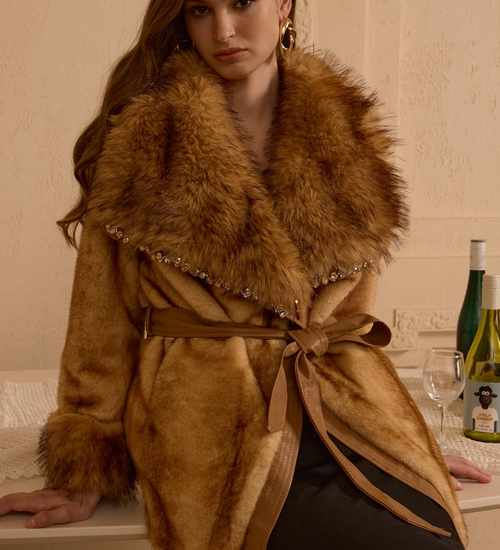 Kristallkaunistustega lipsuga karvane mantel