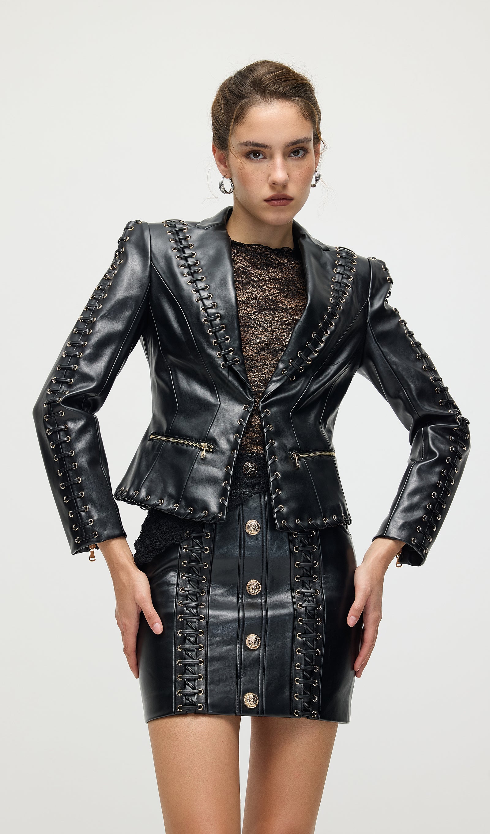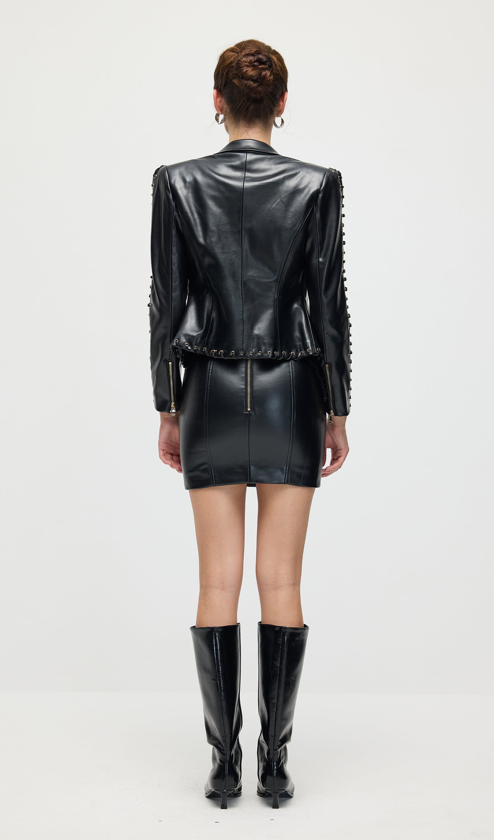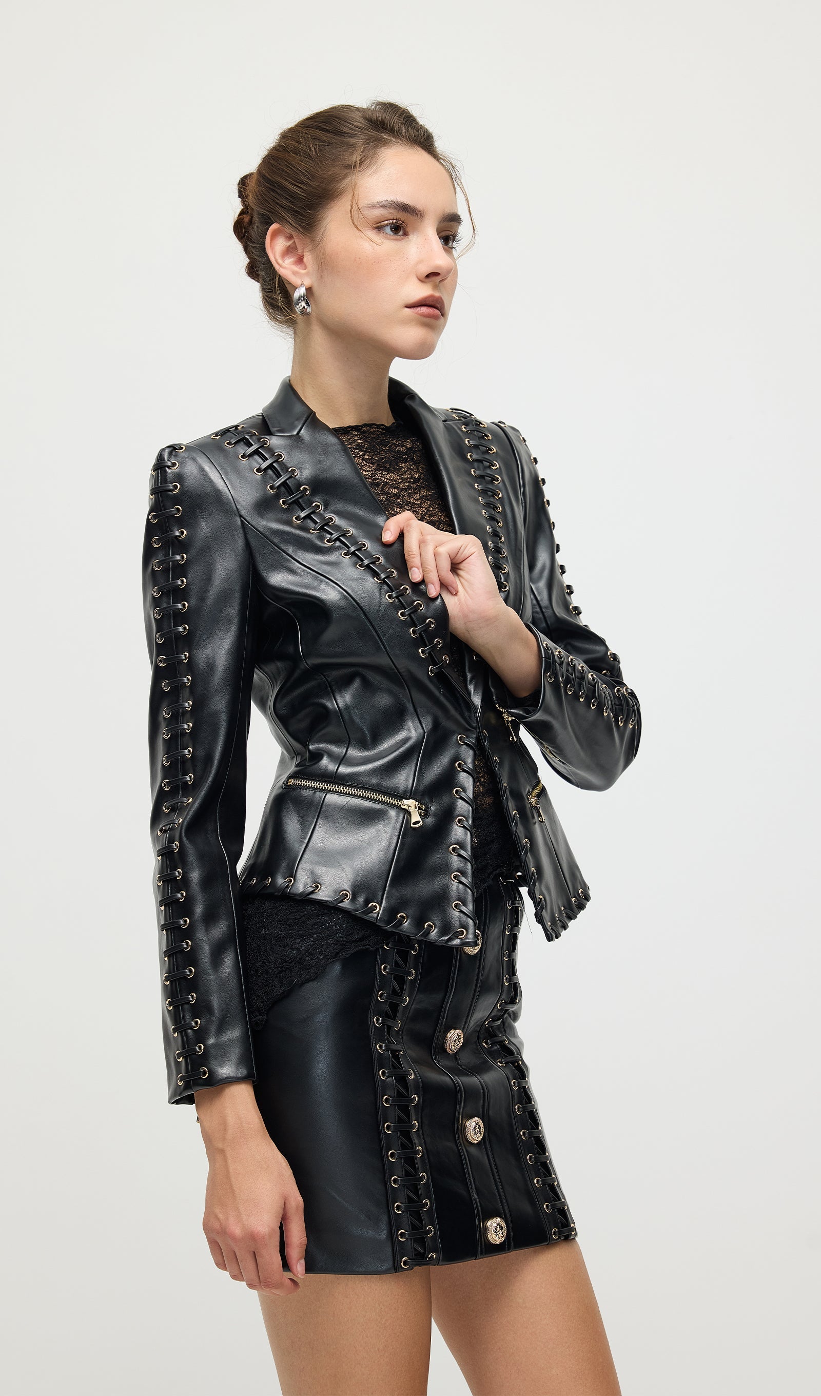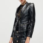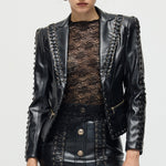 Täienda oma garderoobi Köispaela Nahktagi ja Mini Seeliku komplektiga, mis ühendab äärmusliku elegantsi ja kaasaegse stiili. Tagi on varustatud keerukate köispaela detailidega, mis rõhutavad selle robustset nahktekstiuri. Sobiv mini seelik täiendab komplekti sujuva ja sobiva siluetiga, luues julge väite. See duo pakub mitmekesisust ja rafineeritud serva, ideaalne enesekindlatele, moeteadlikele välimustele.