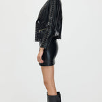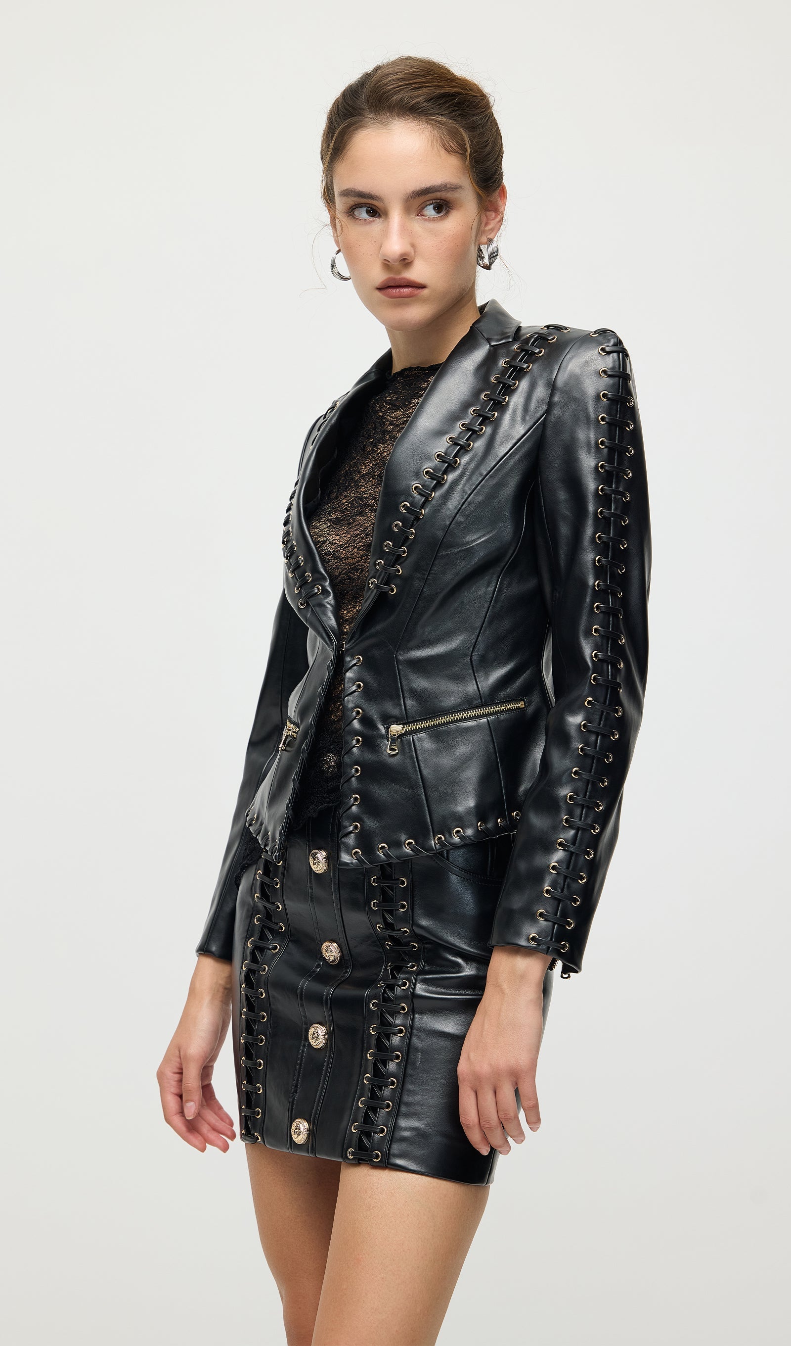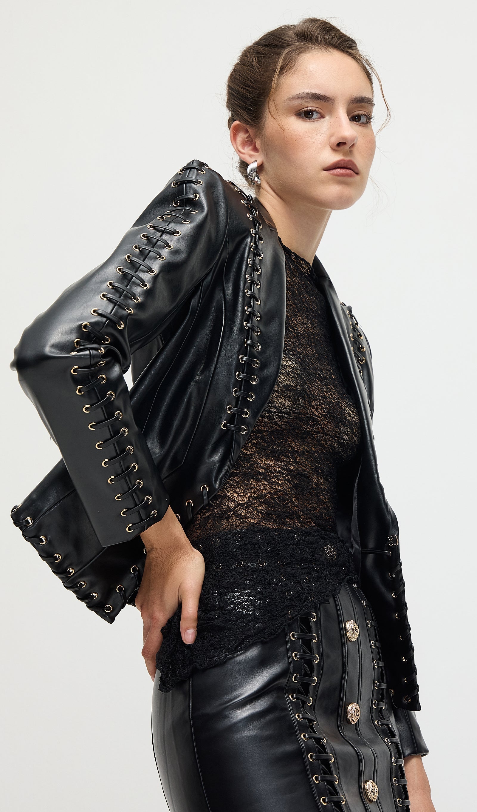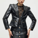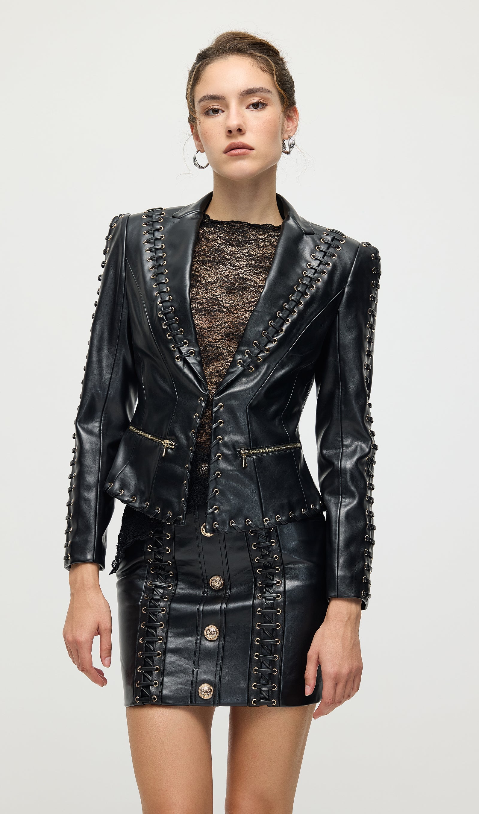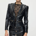Täienda oma garderoobi Köispaela Nahktagi ja Mini Seeliku komplektiga, mis ühendab äärmusliku elegantsi ja kaasaegse stiili. Tagi on varustatud keerukate köispaela detailidega, mis rõhutavad selle robustset nahktekstiuri. Sobiv mini seelik täiendab komplekti sujuva ja sobiva siluetiga, luues julge väite. See duo pakub mitmekesisust ja rafineeritud serva, ideaalne enesekindlatele, moeteadlikele välimustele.