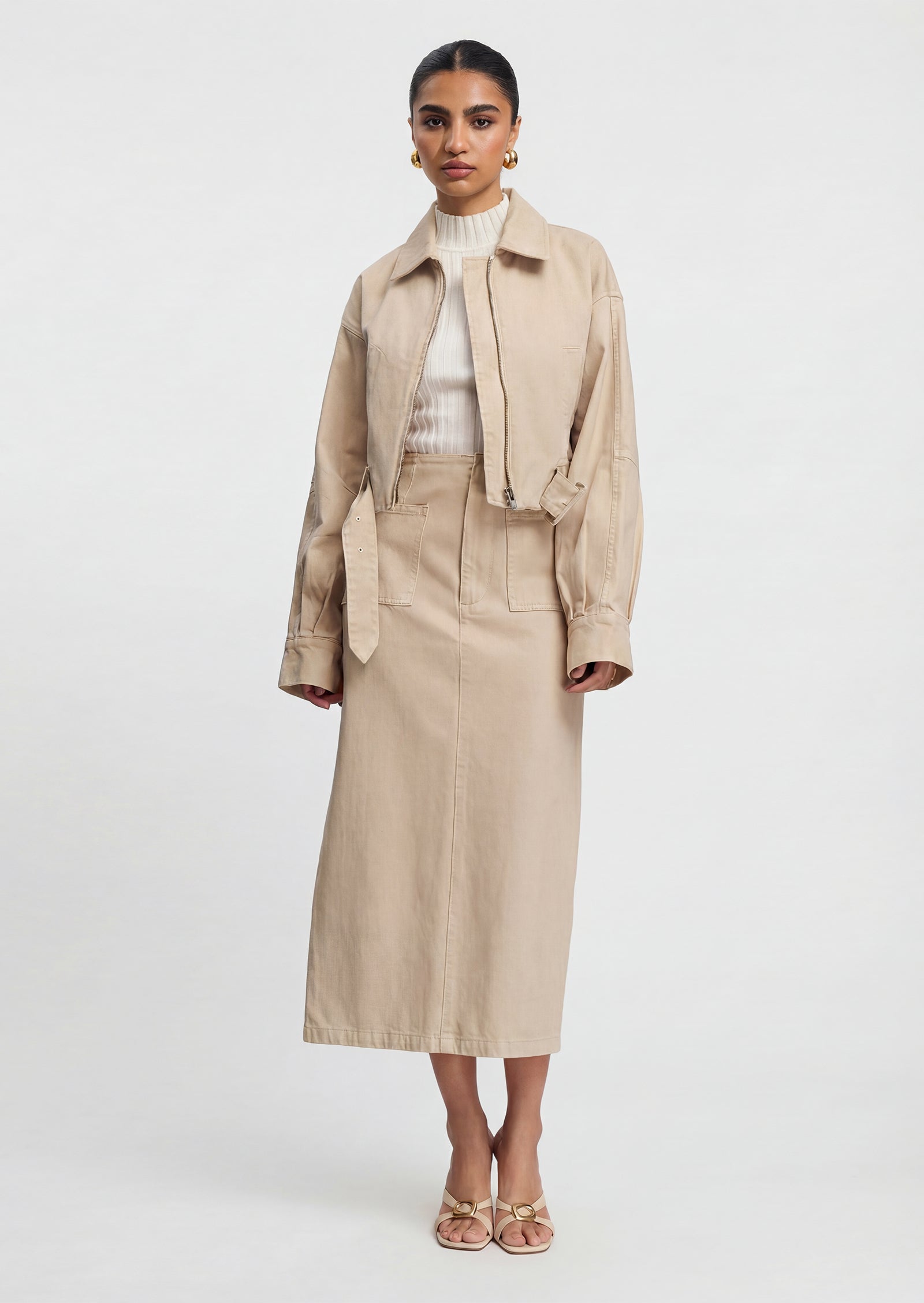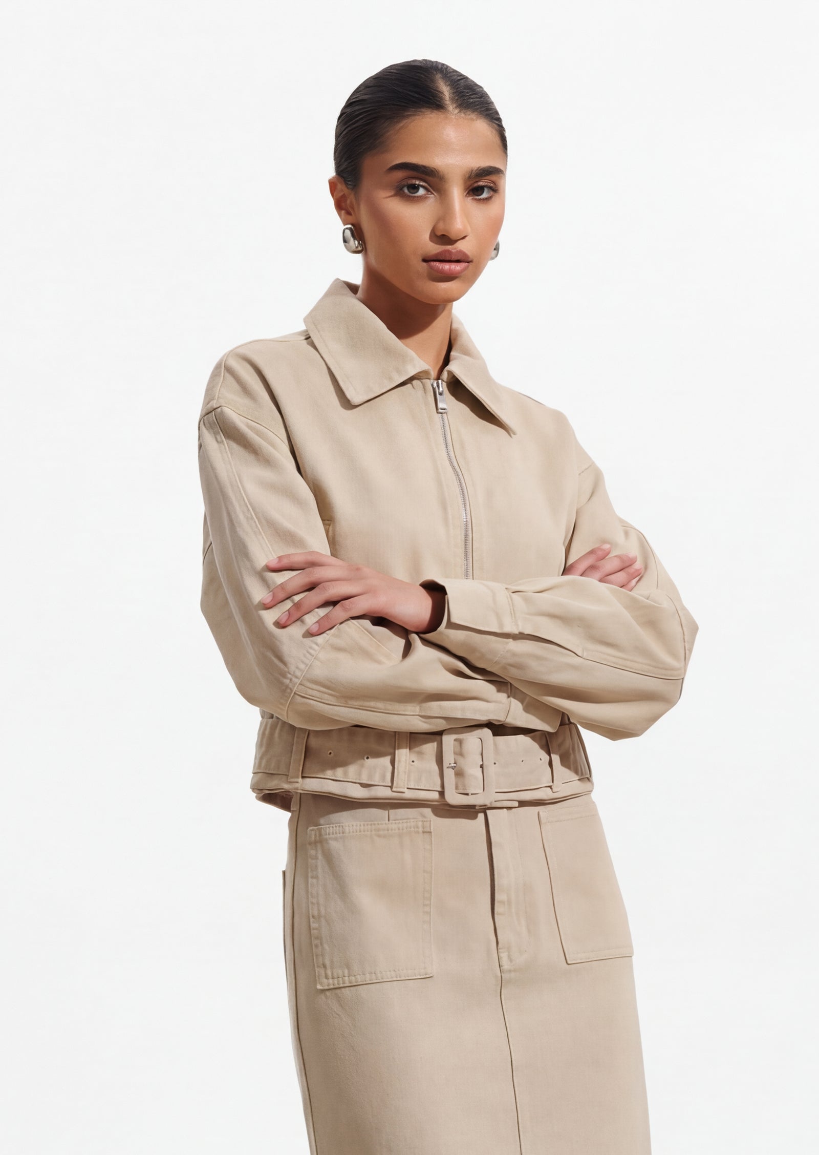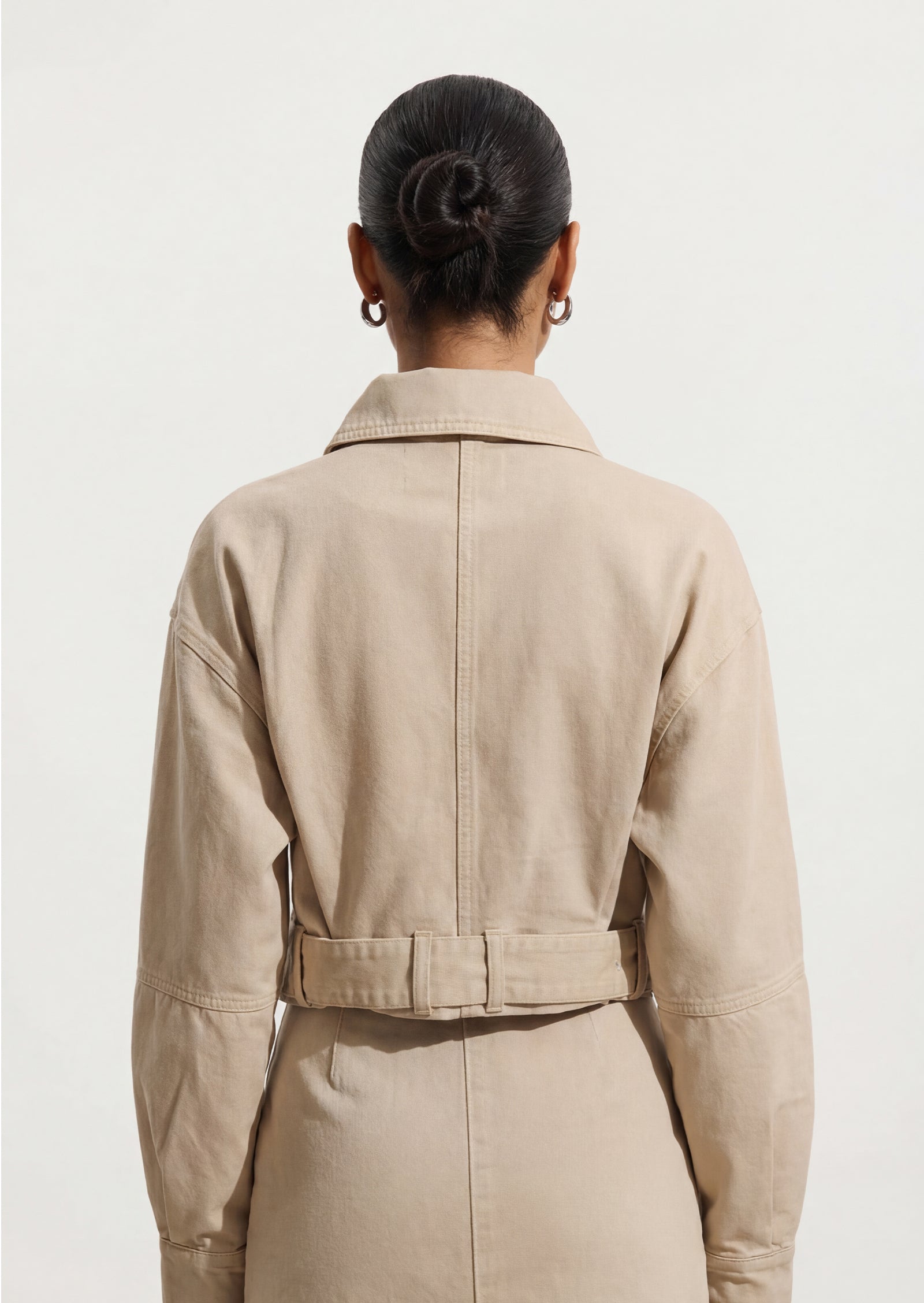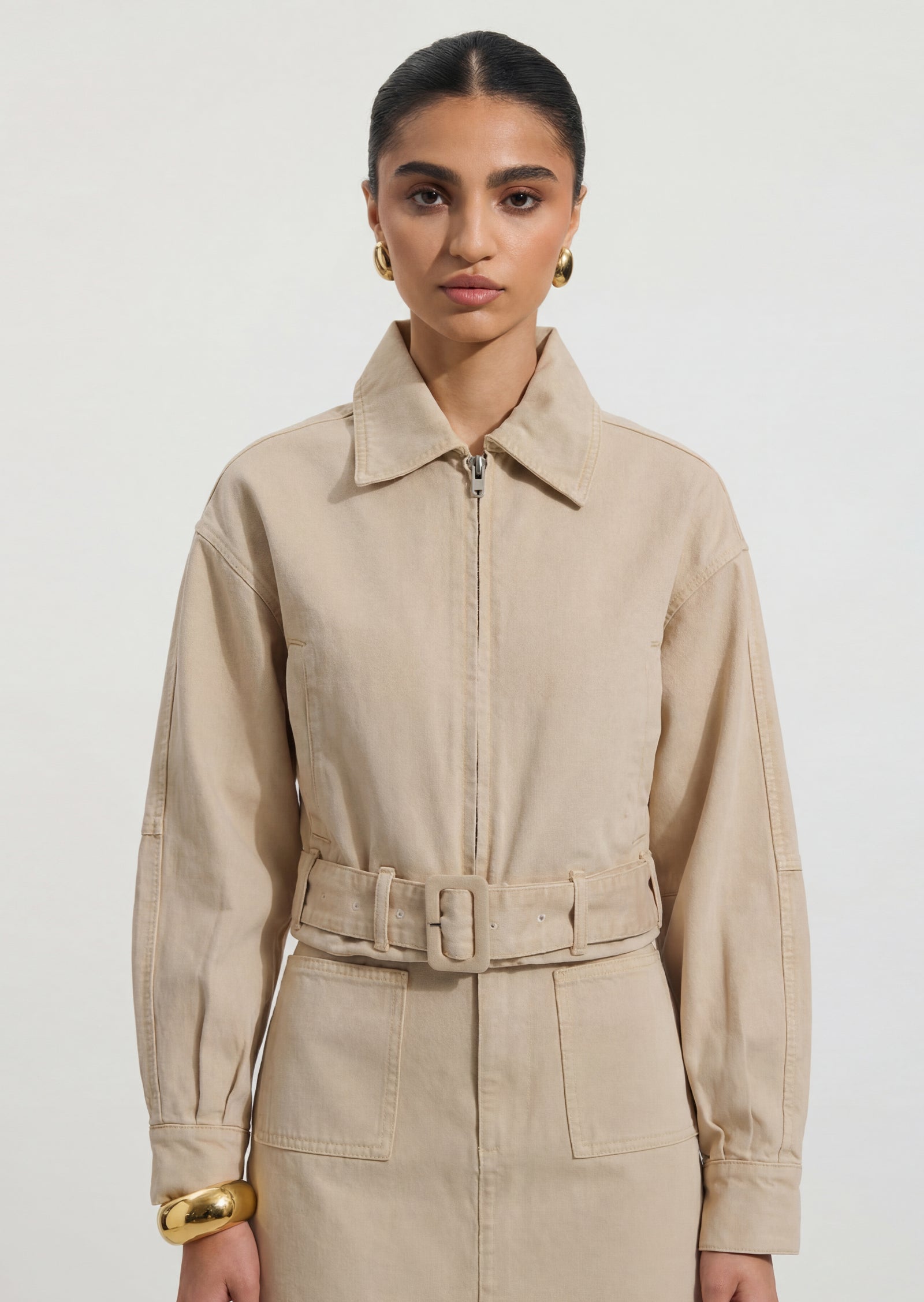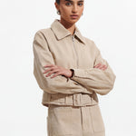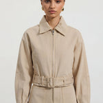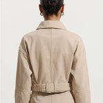 Lühike Denim Jakk on ideaalne valik teie lemmik kihiliste rõivaste hulka. Sellel on kraega kaelus ja eesne lukuga avamine, mis lisavad stiili ja mugavust. Jaki pikad varrukad ja vöö ja klamber tagavad täiusliku istuvuse, samas kui kergelt kogutud äär toob sisse pehme detaili, muutes selle nii kasulikuks kui ka stiilseks.