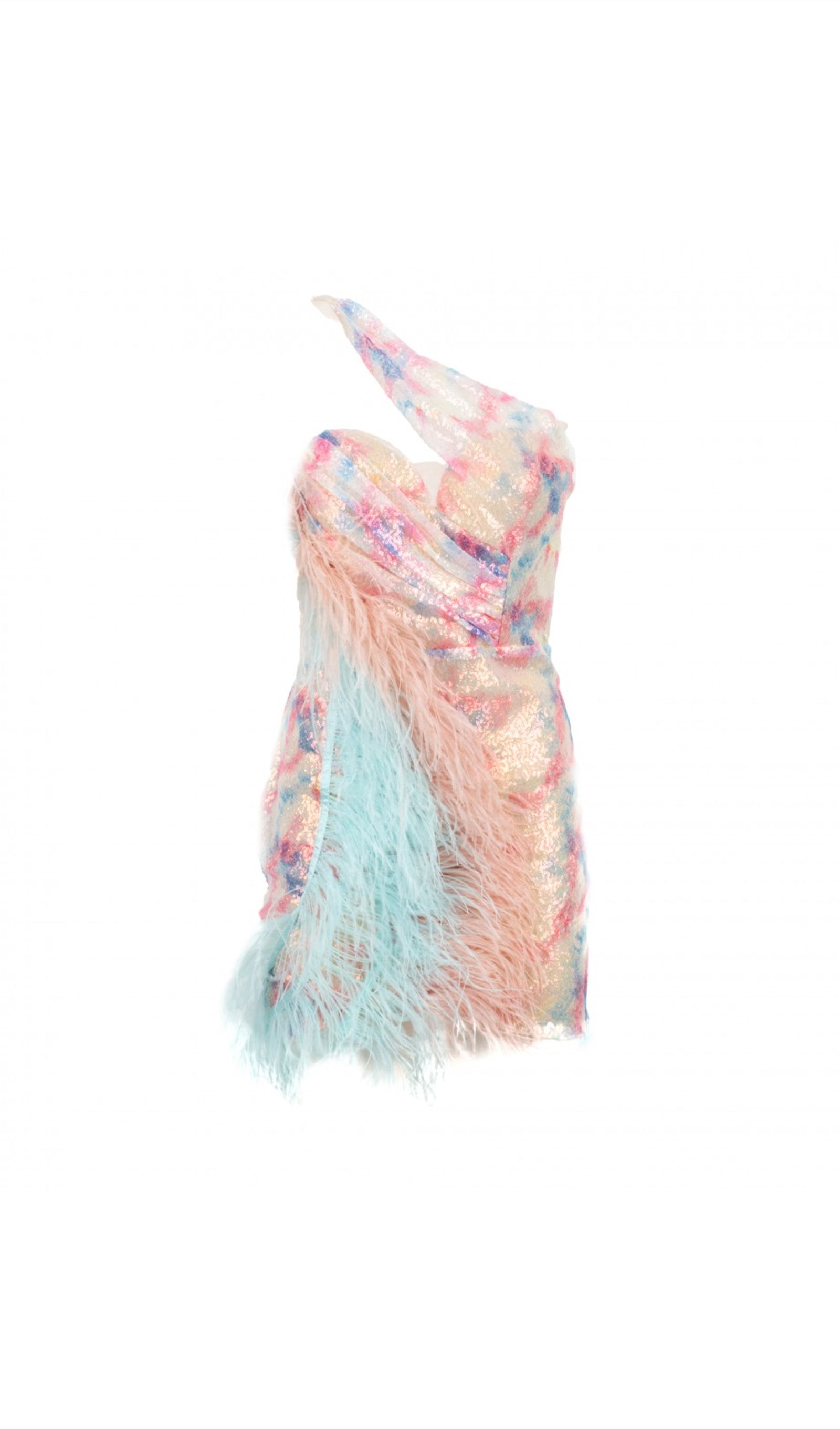 Avasta absoluutne glamuur meie asümmeetrilises sädelevas mini kleidis sulgedega. Sädelevad detailid püüavad valgust, samas kui sulgede kaunistused lisavad elegantsi. Asümmeetriline disain rõhutab sinu kurve õigetes kohtades, muutes selle kleidi täiuslikuks valikuks eriliseks sündmuseks või õhtuseks väljasõiduks.