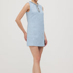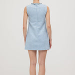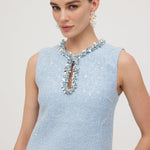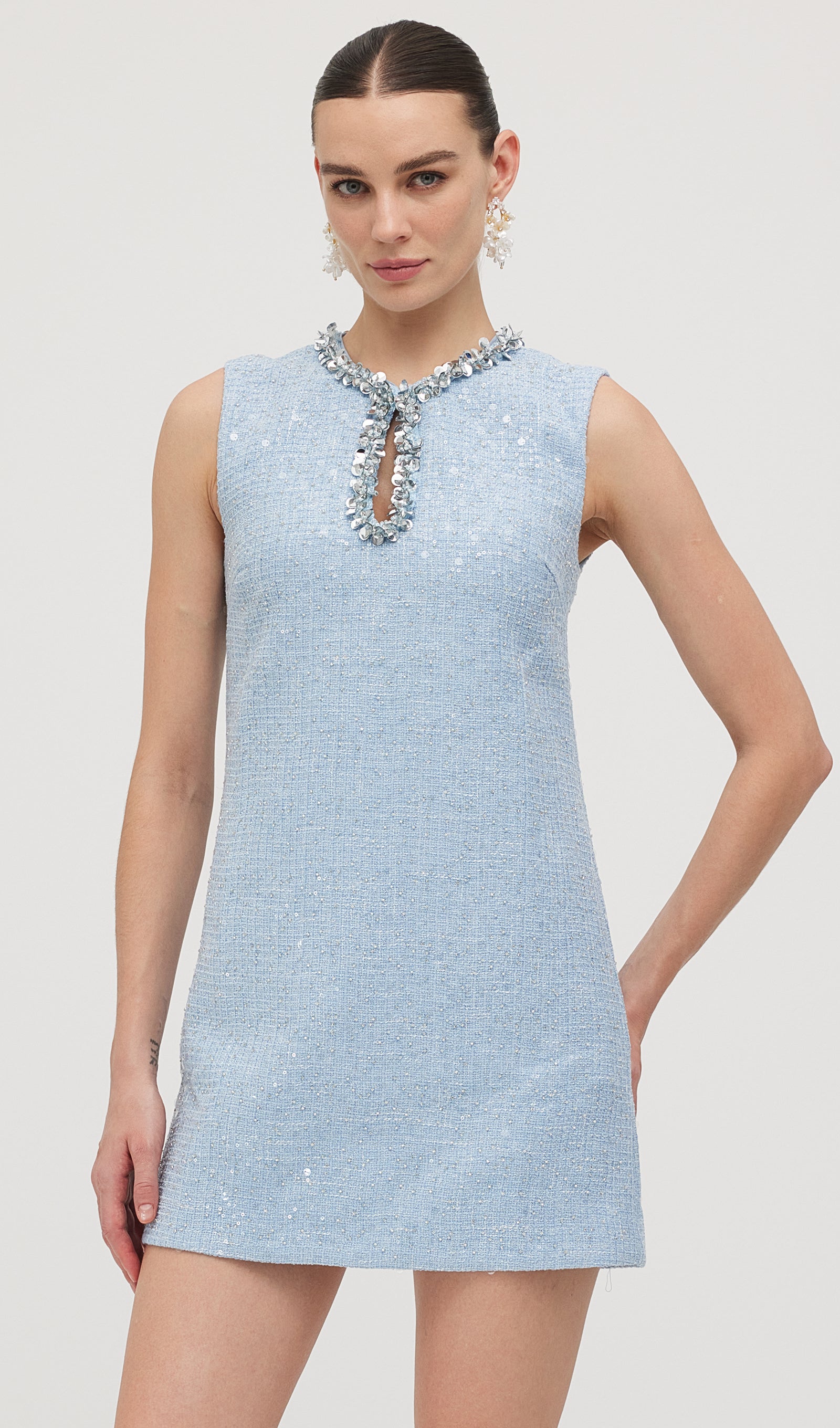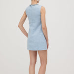 Avasta oma uue lemmik peokleit! Flirtiv mod-inspireeritud disain sinisest sädelevast bouclé'st tagab laitmatu sobivuse, olgu sa moes hilineja või täpne. Ümar kaelus ja võtmeaugu lõige, kaunistatud silmapaistva äärisega, loob elegantse shift-silueti ja pikendab jalgu. Kombineeri seda kõrgete platvormide ja sobiva Bow Bag'iga, et olla valmis oma järgmisteks öisteks seiklusteks!