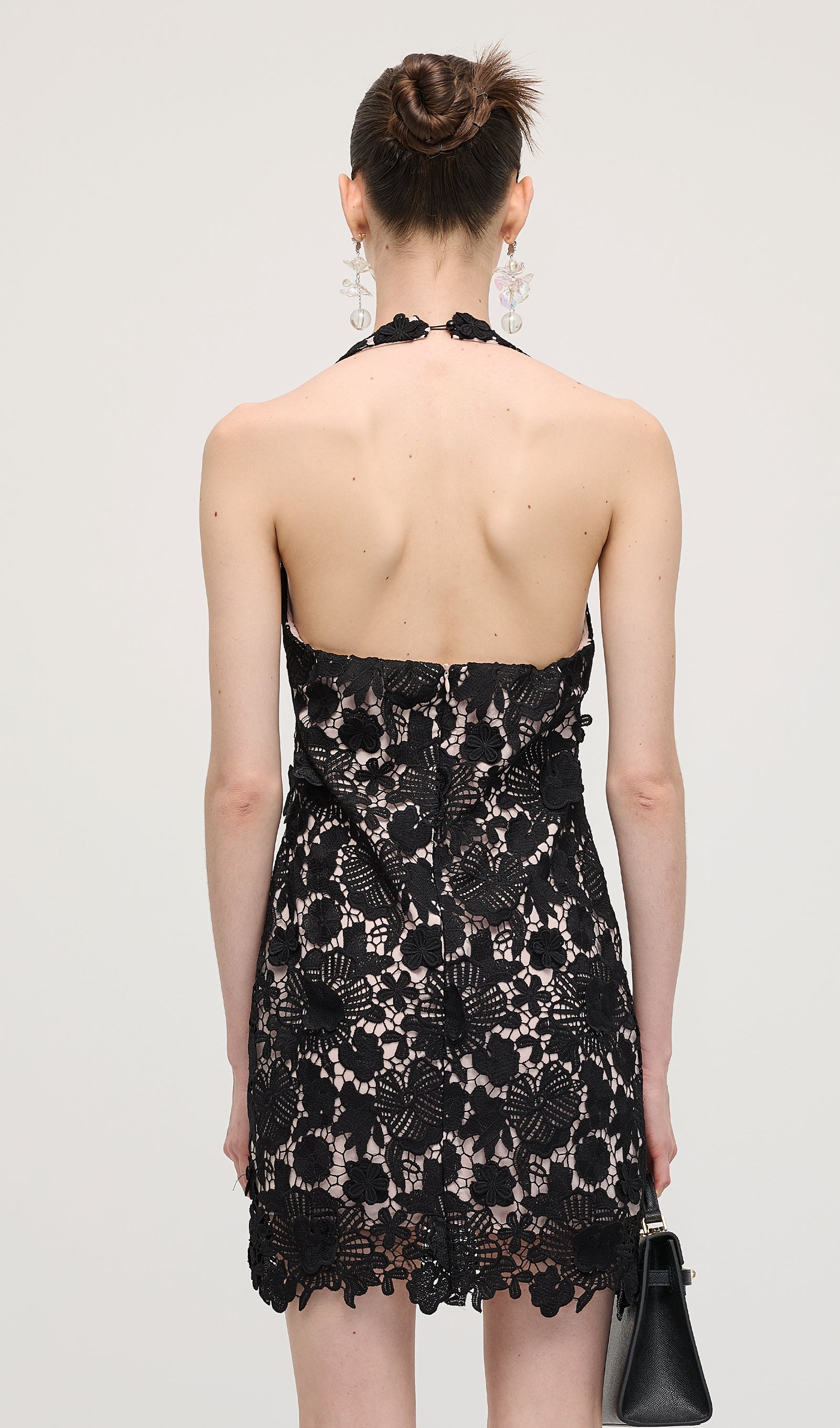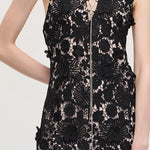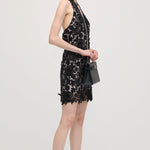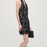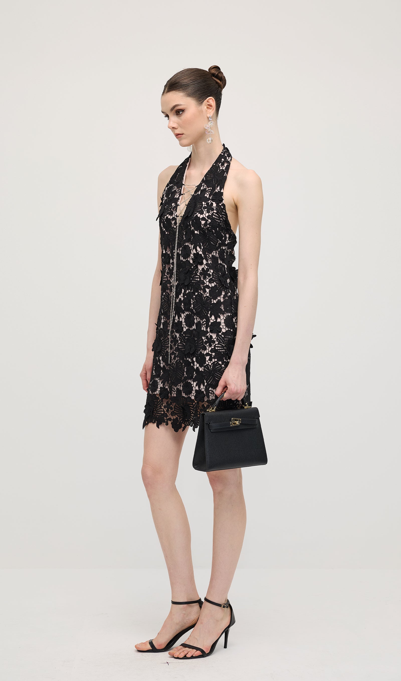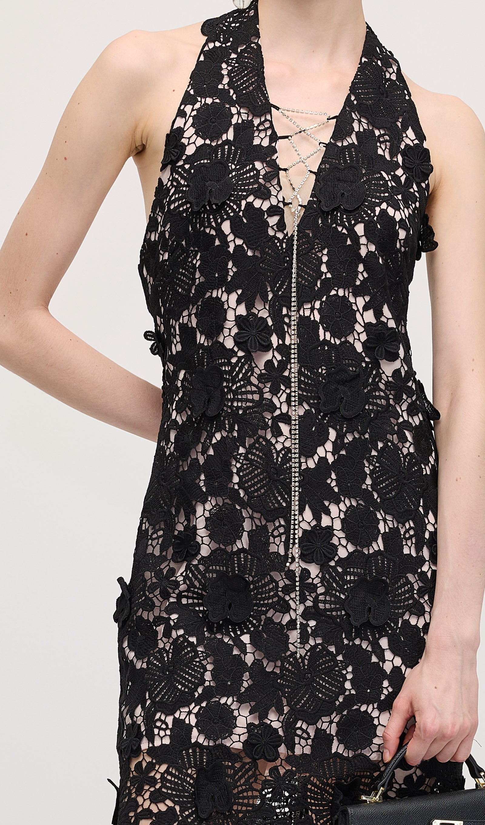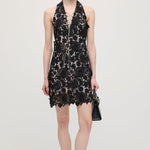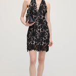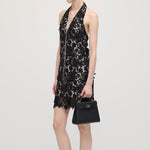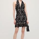 Avasta must halteri pitsmini kleit, mis ühendab elegantsi ja kaasaegse silueti. Valmistatud õrnast pitsist, pakub see liibuva istuvust, mis rõhutab kaunilt õlgu ja dekolteed. Ideaalne õhtusündmusteks või erilisteks puhkudeks, selle keeruline detail ja sujuv disain tagavad rafineeritud ja enesekindla välimuse.