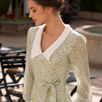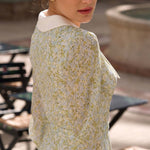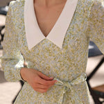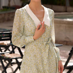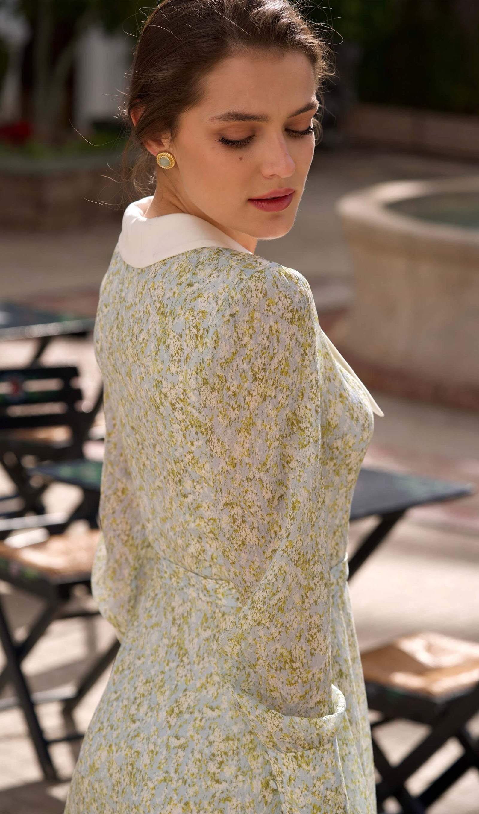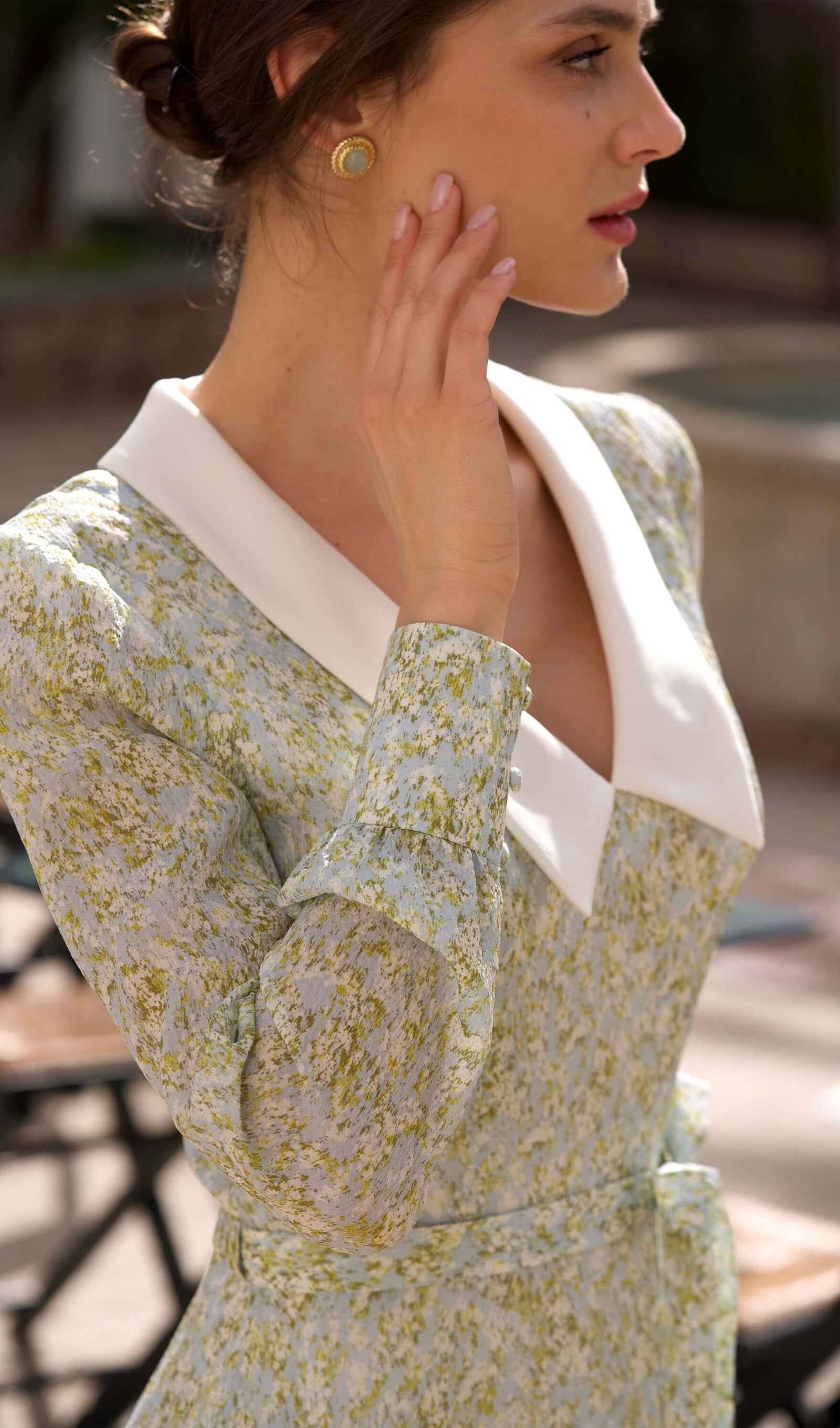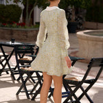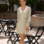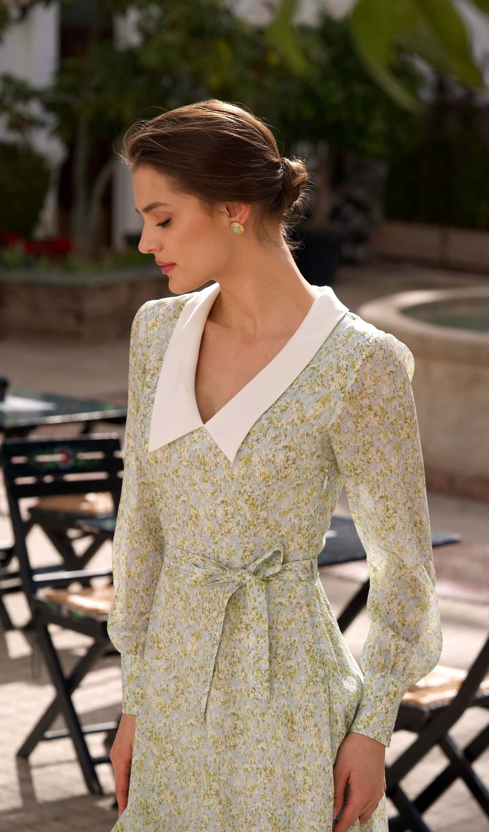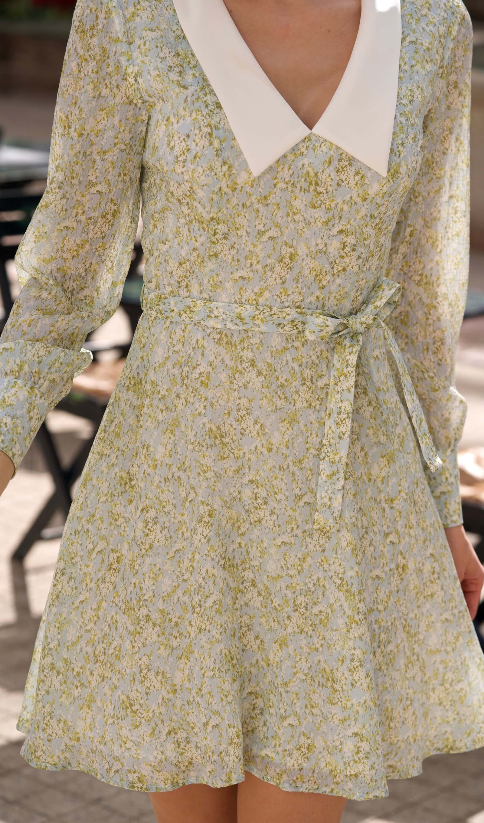 Discover our playful mini dress crafted from lightweight recycled chiffon silk. Featuring a deep V-neck and bishop sleeve cuffs with buttoned details, this dress beautifully accentuates your narrow waist and highlights your silhouette. The design is completed with a vibrant layered ruffled skirt, perfect for making a statement.