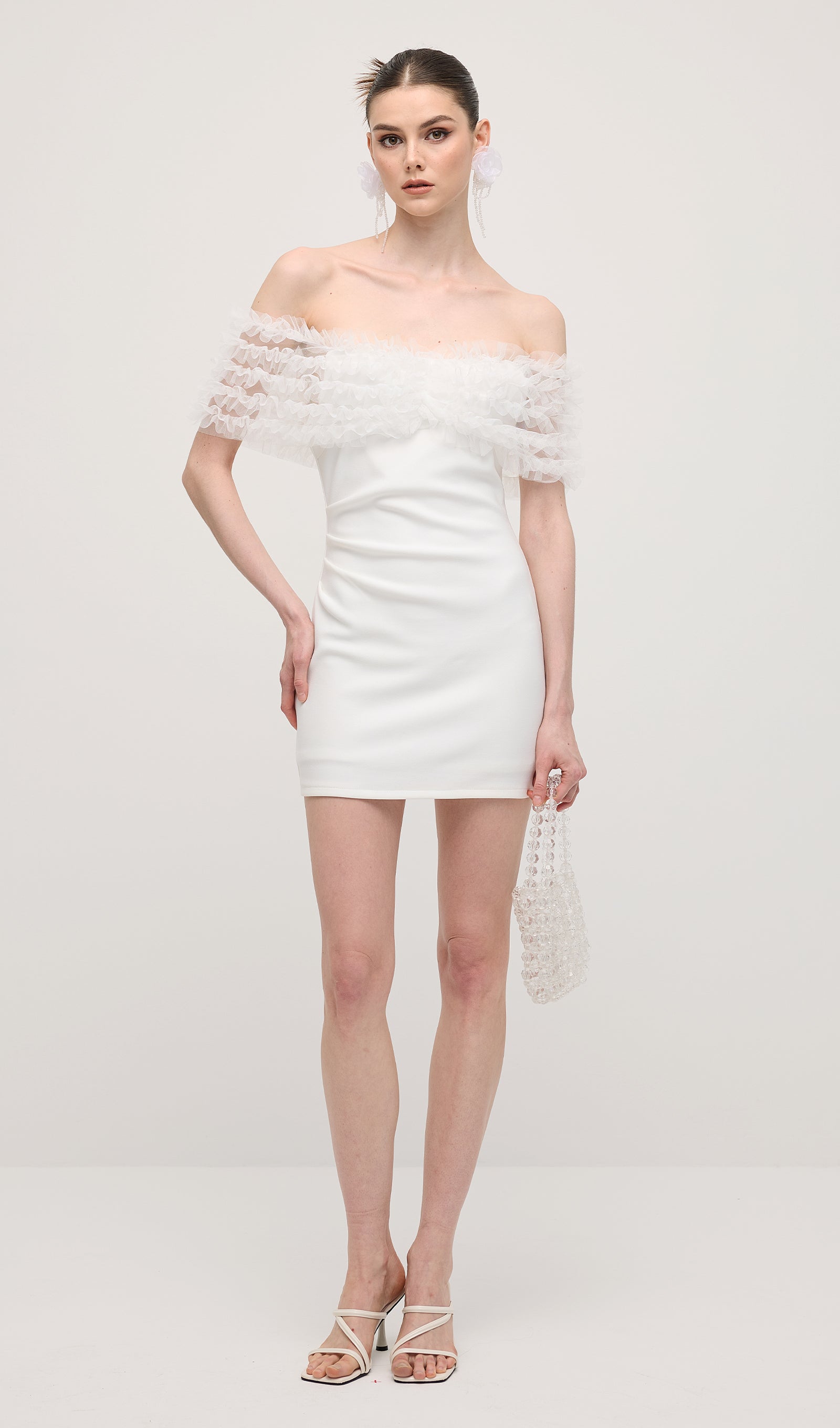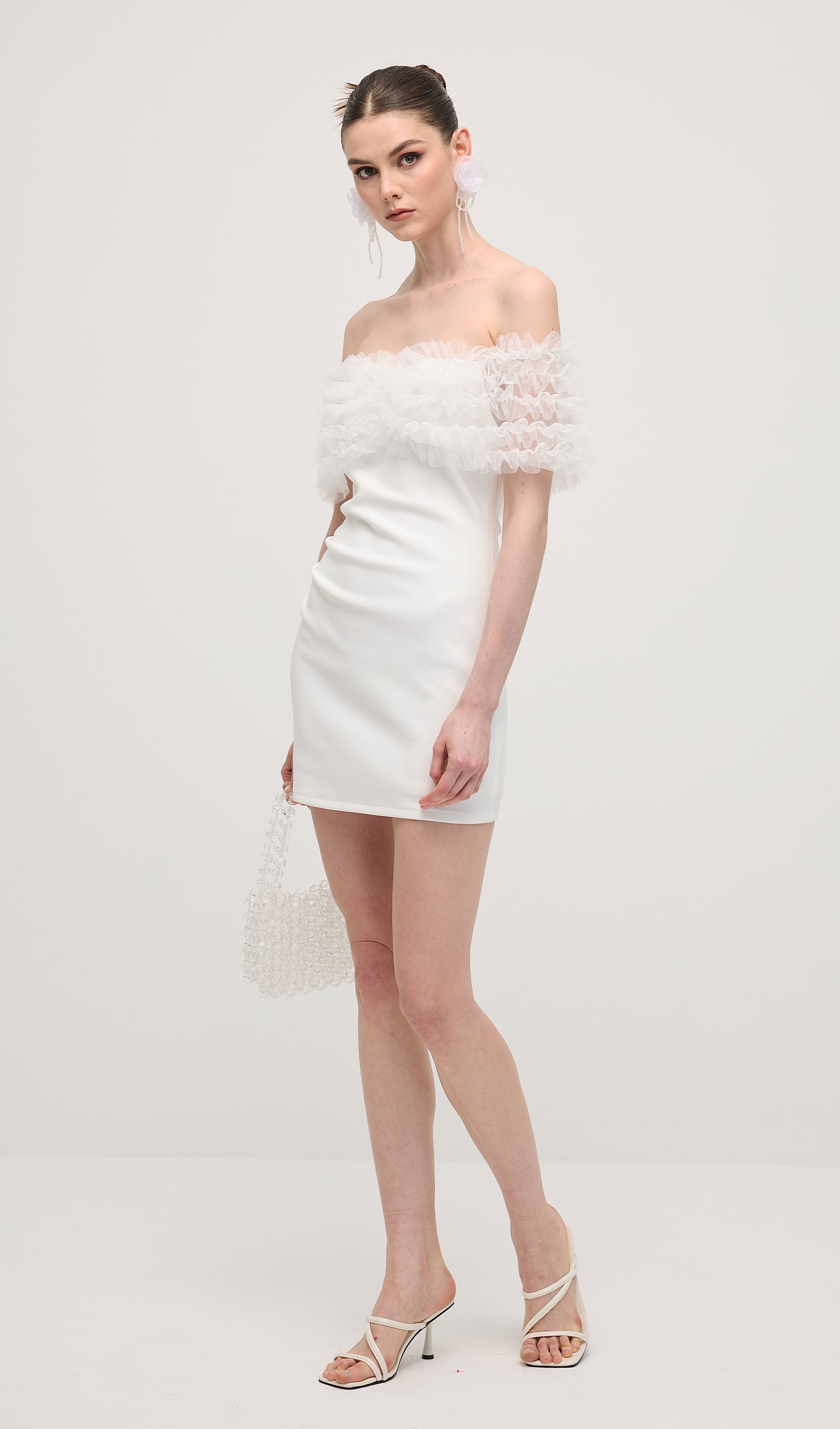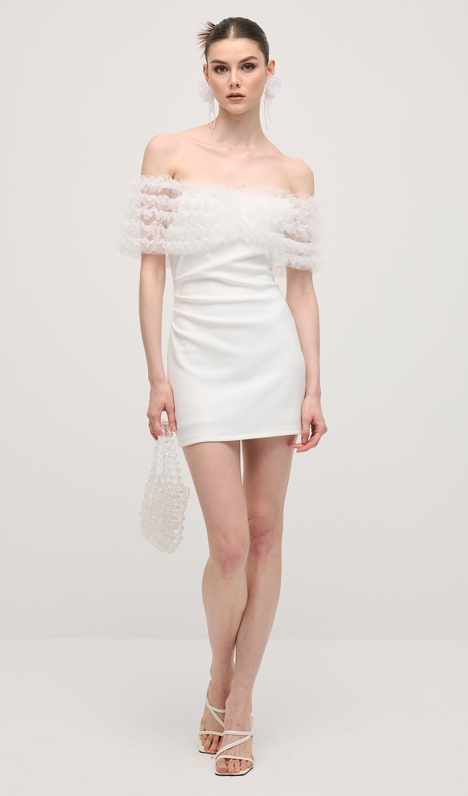 Avasta oma stiil õlavarrelt väljaulatuva lillelise tülli mini kleidiga, mis ühendab õrna lilleline tikandi ja kergelt tüllkangaga, luues elegantse ja õhulise välimuse. Selle disain rõhutab kaelust, samas kui mini pikkus lisab nooruslikku ja modernset puudutust. Ideaalne erilisteks sündmusteks, see kleit pakub nii stiili kui ka mugavust, olles rafineeritud valik neile, kes otsivad keerukat, kuid mängulist riietust.