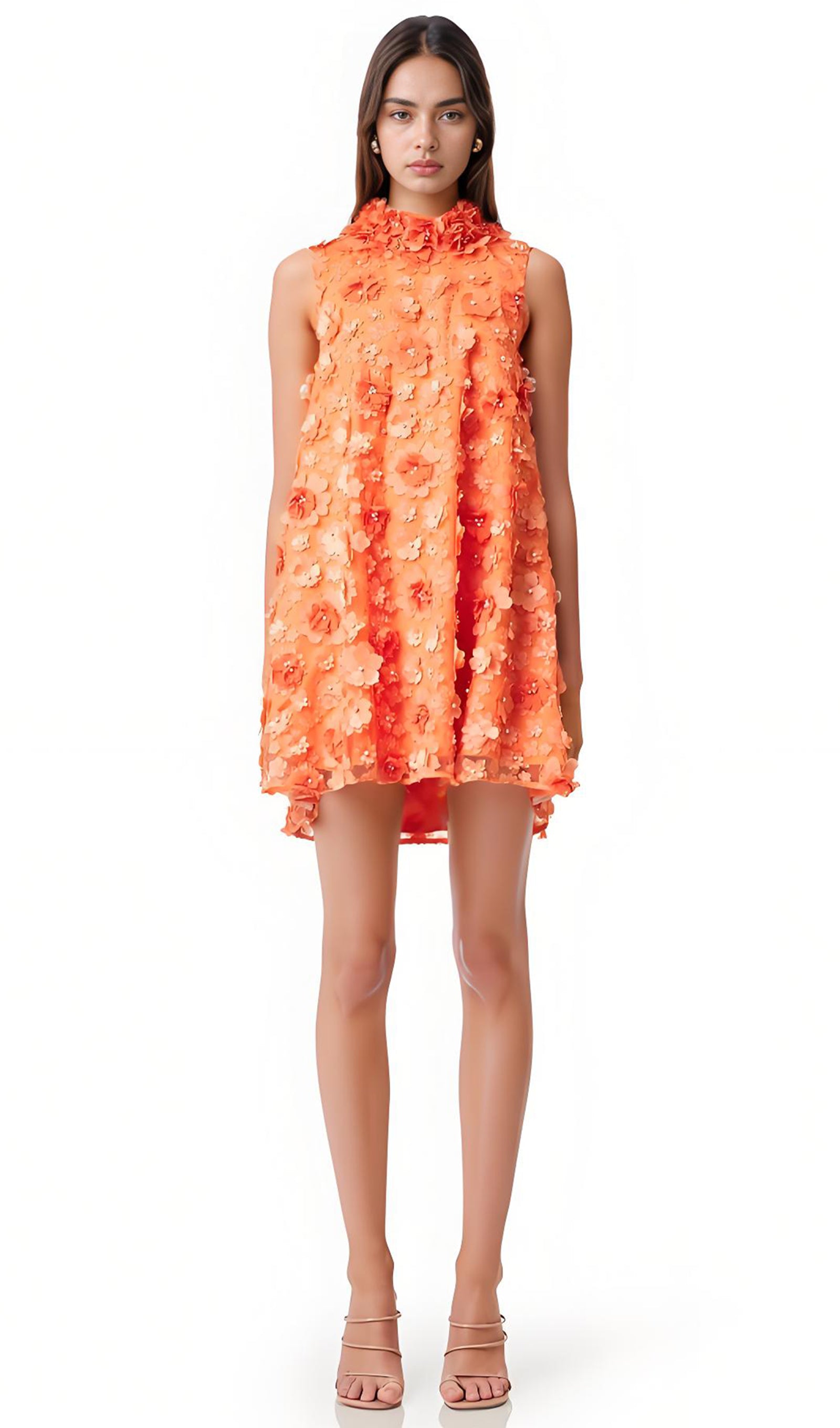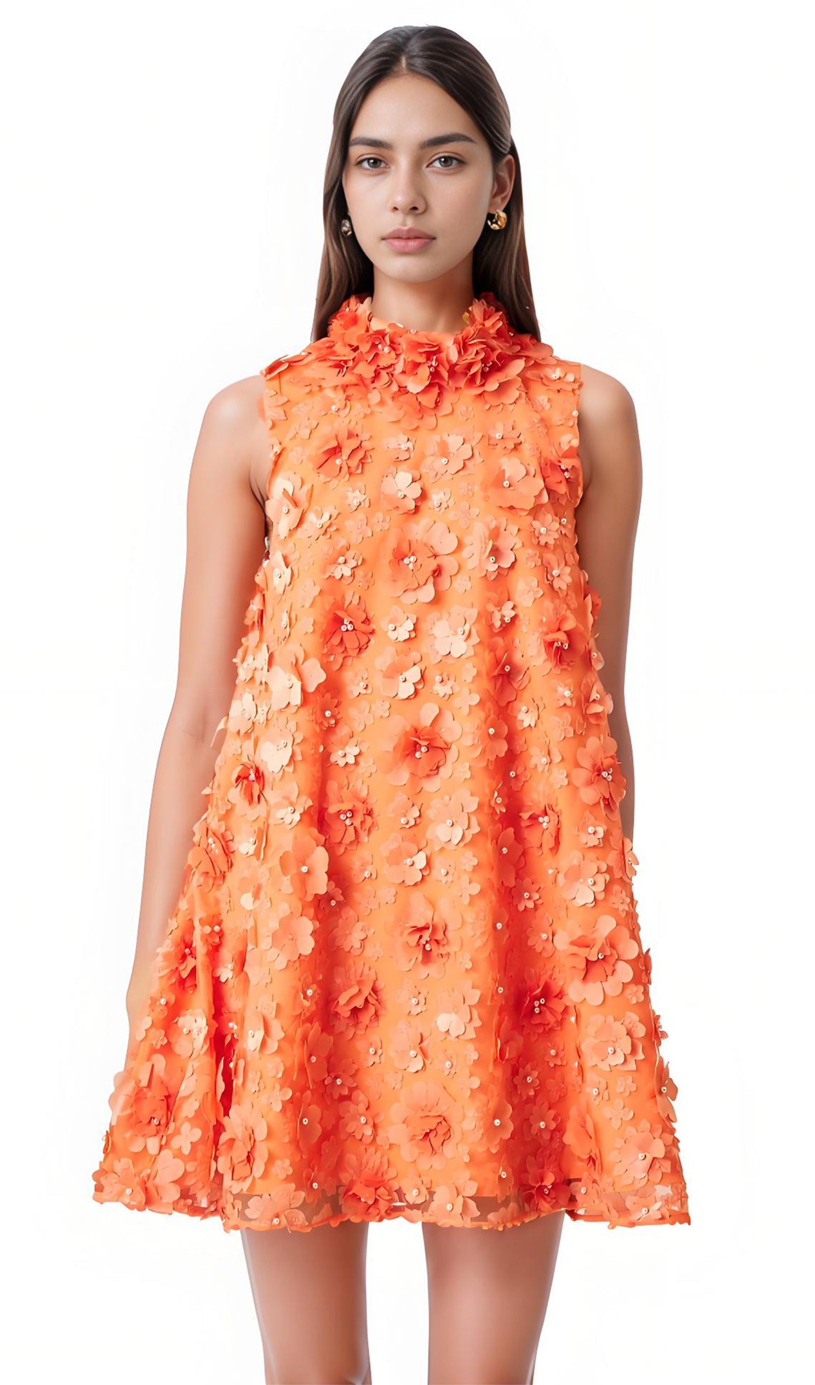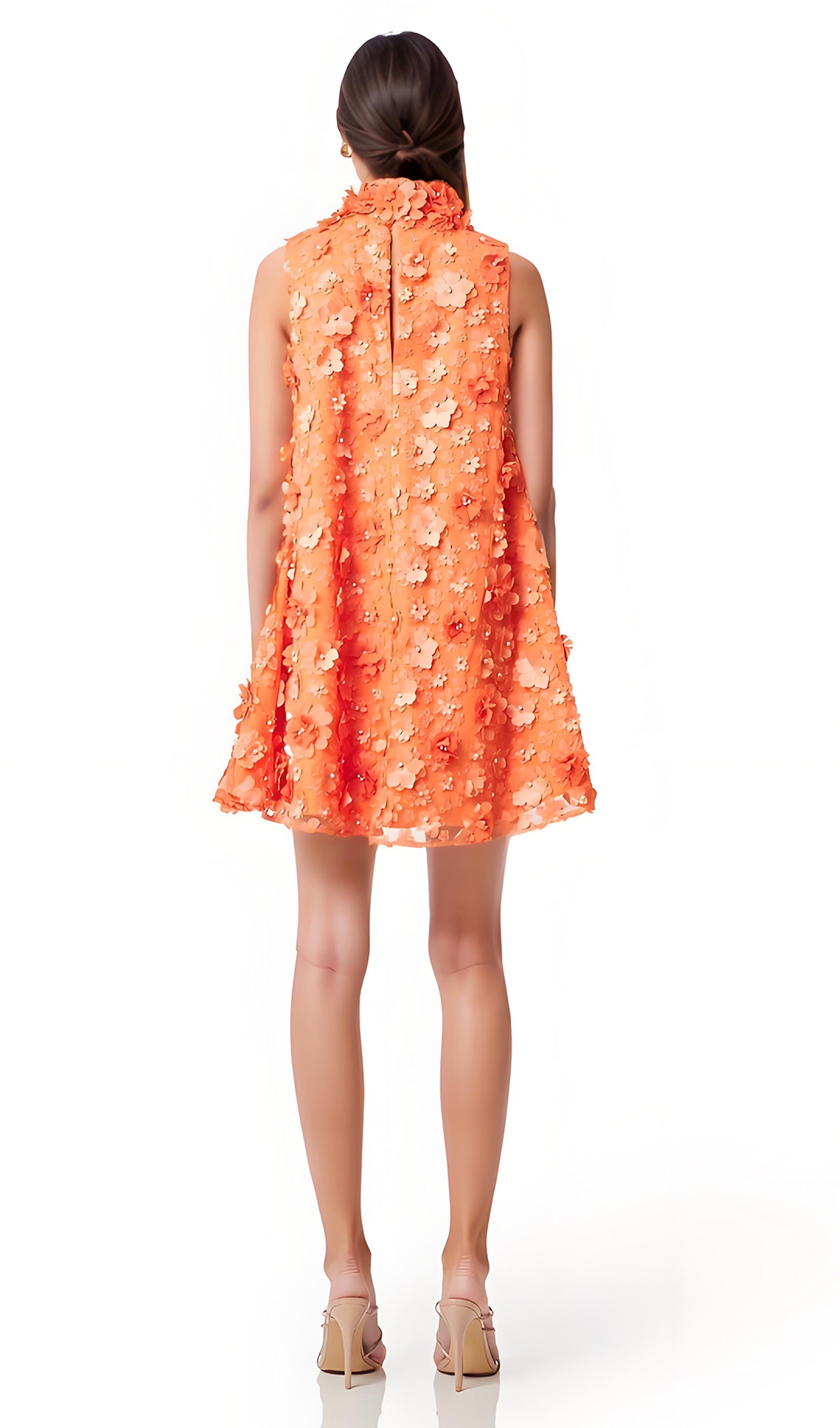Oranž Lilleline Kõrge Kaelusega Trapeze Mini Kleid