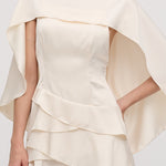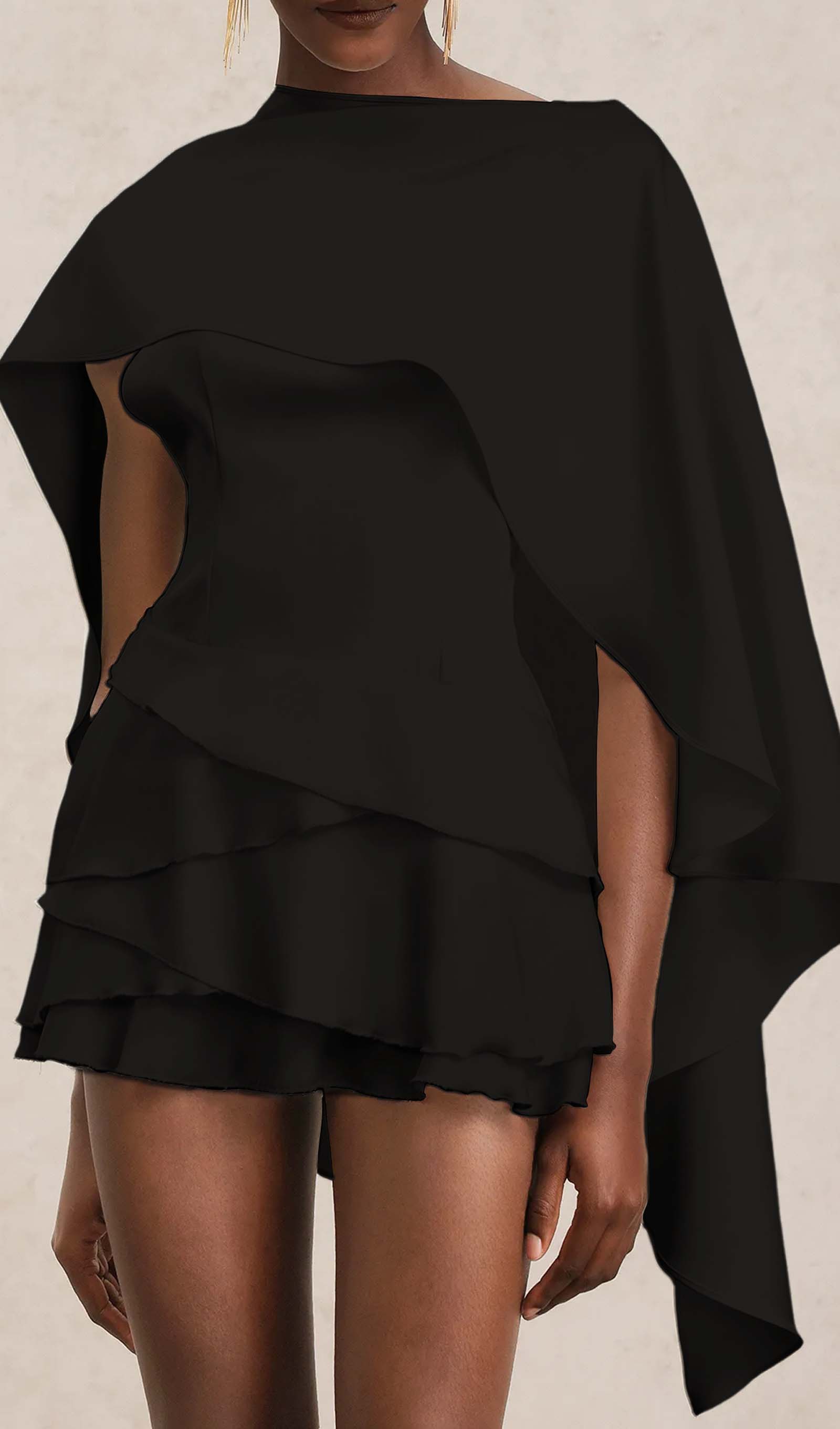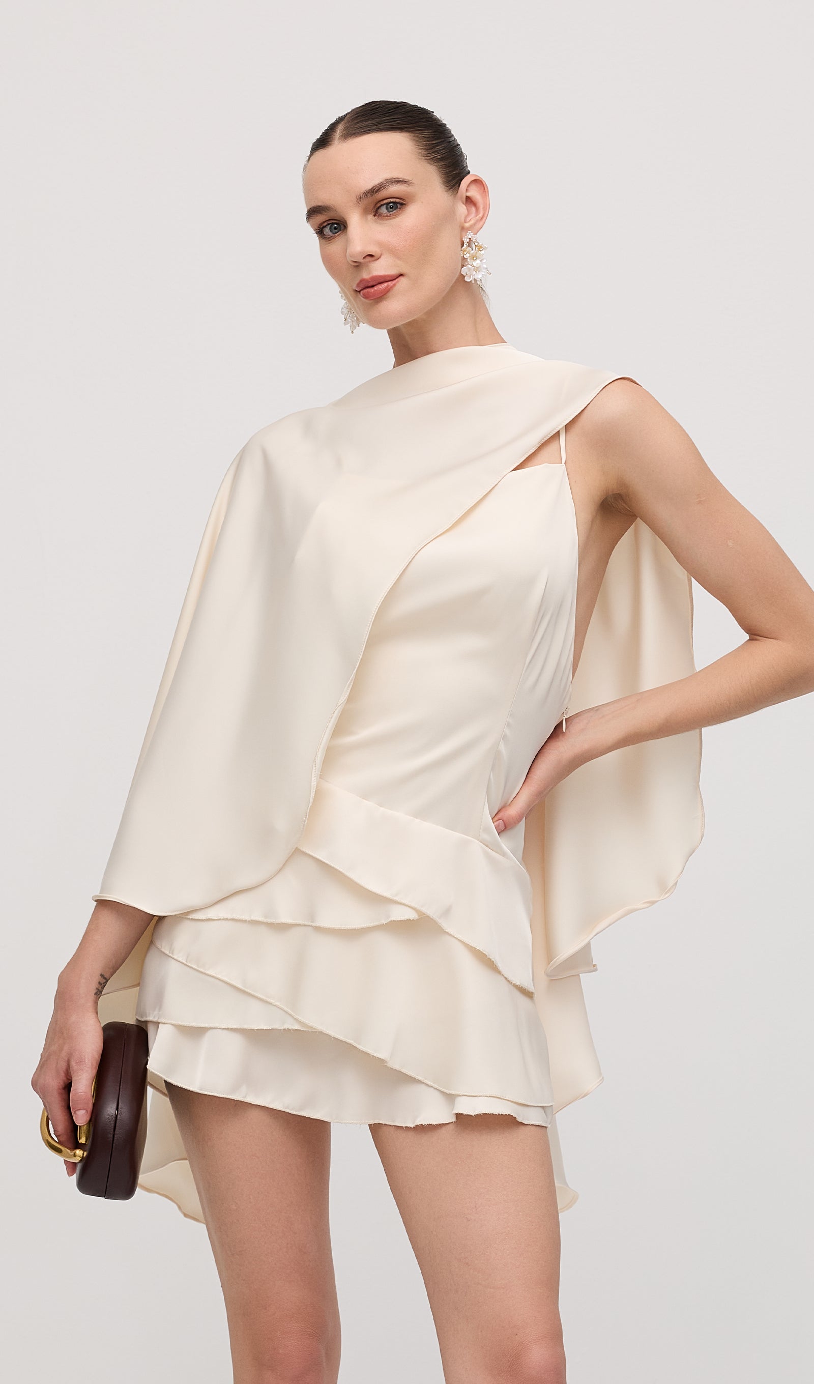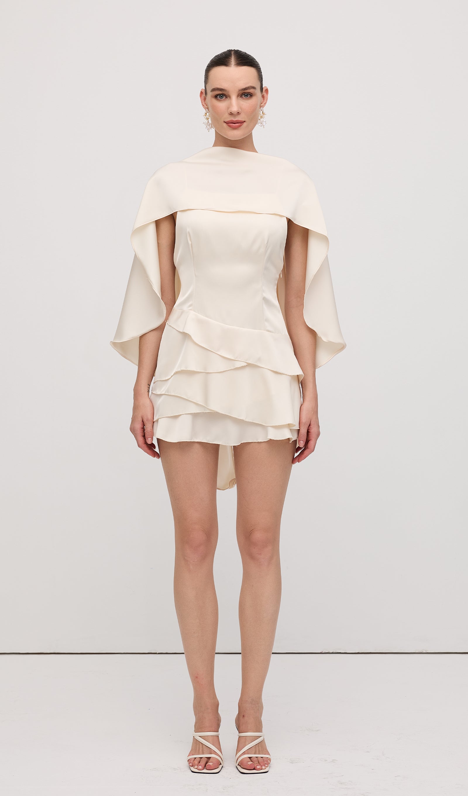 Avasta meie satiinisest kappa kaheosaline mini kleit, mis ühendab elegantsi ja mitmekesisuse. Libisev kleit, valmistatud luksuslikust satiinist, ja volangidega kappa loovad täiusliku kombinatsiooni. Ilma varrukateta disainiga on see kleit ideaalne igaks juhuks, muutes sind enesekindlaks ja šikiks.