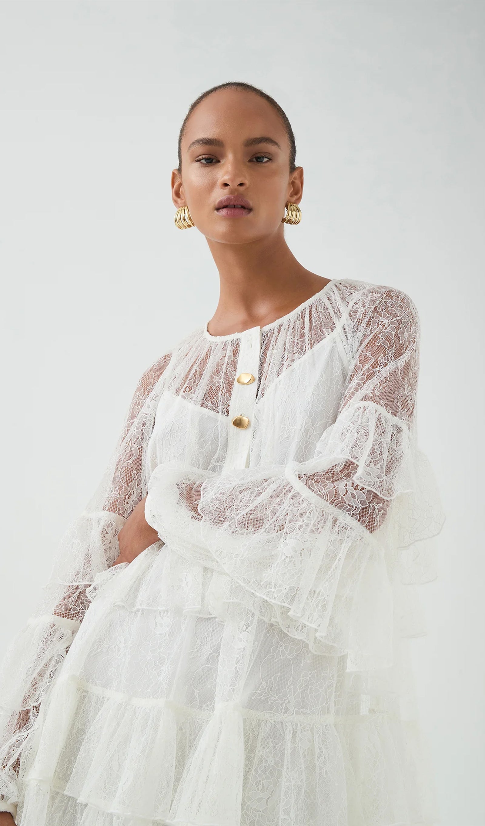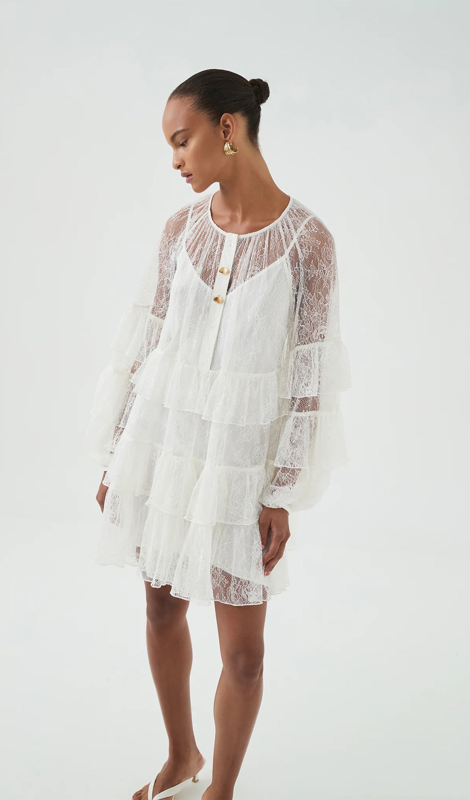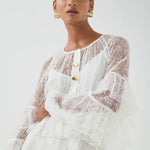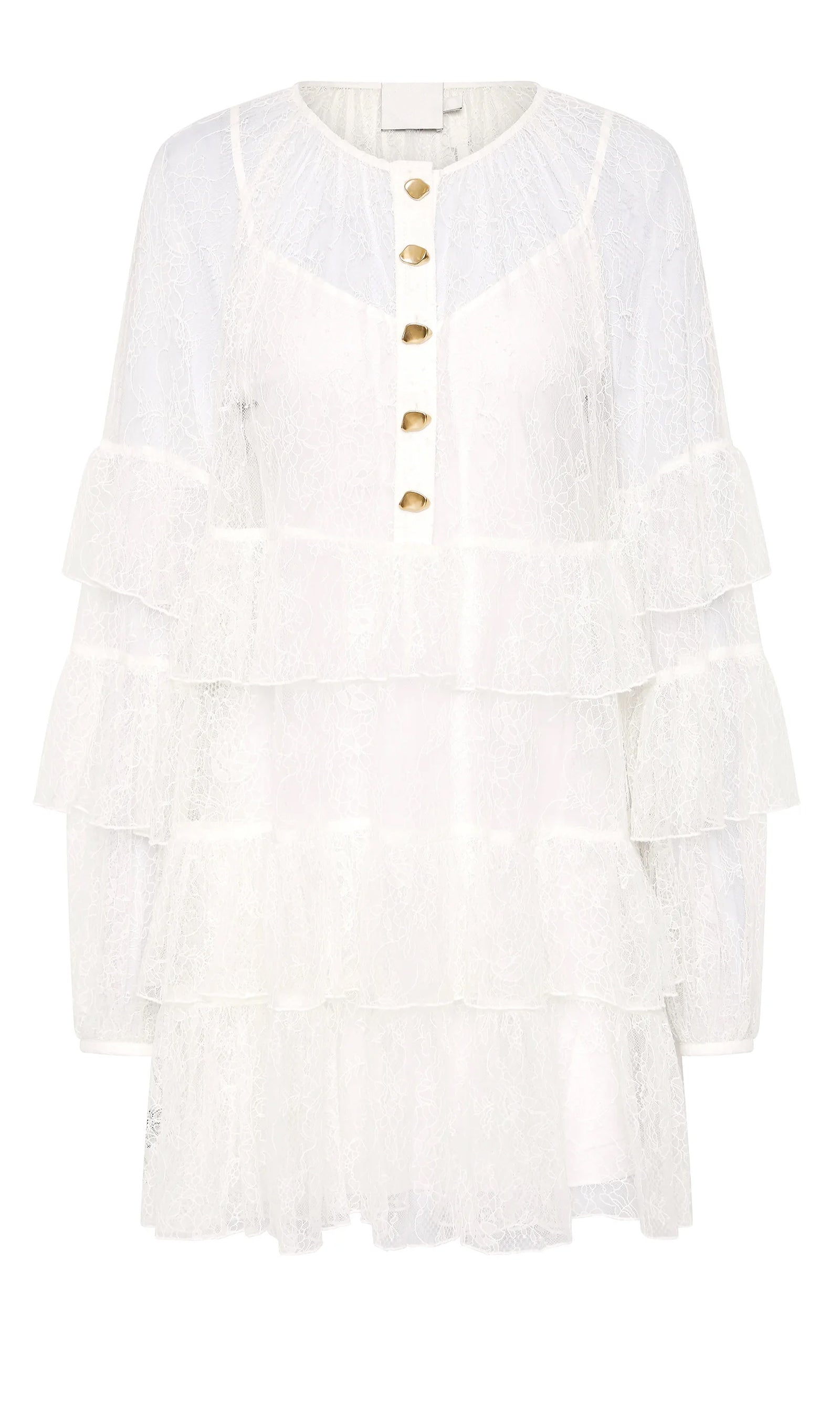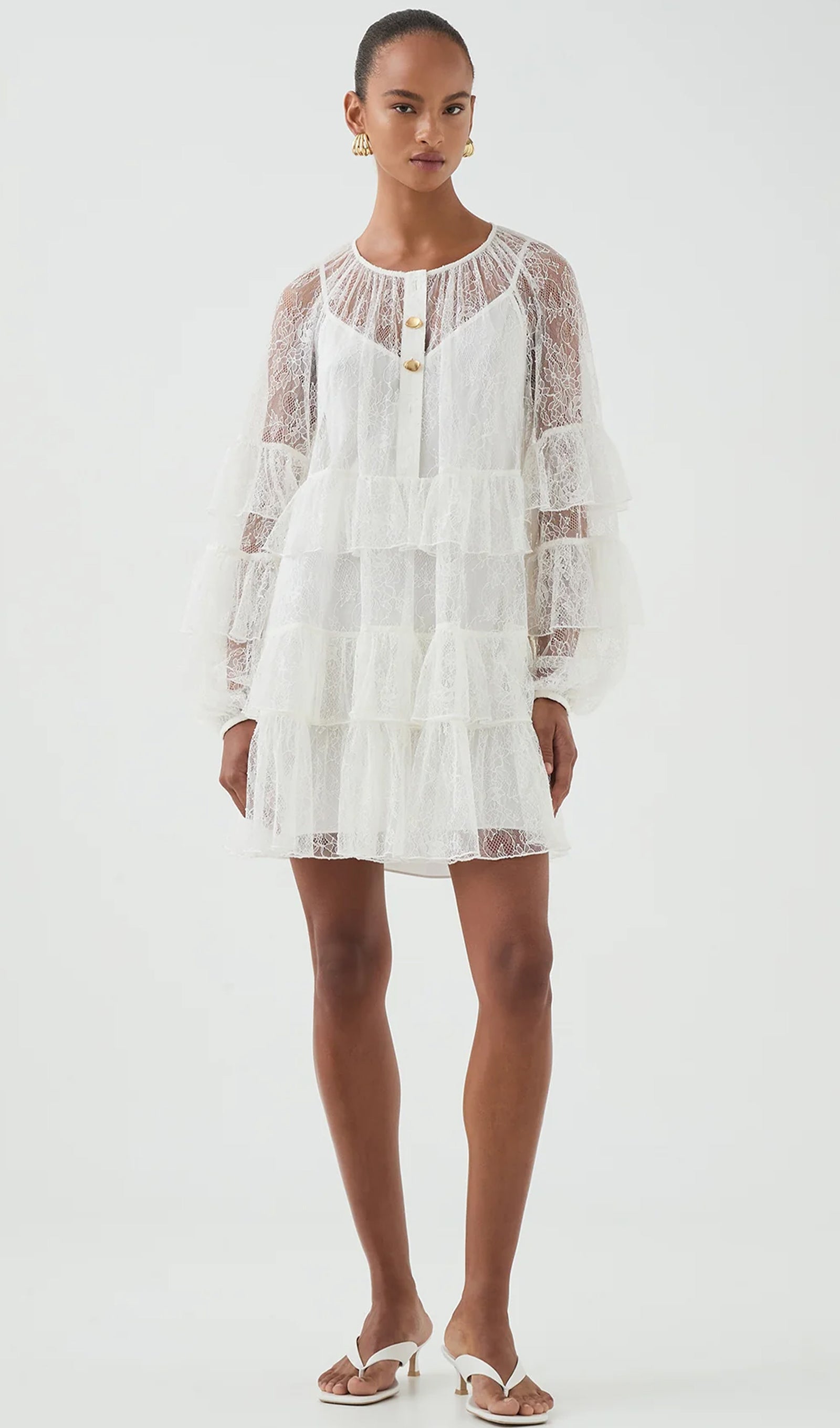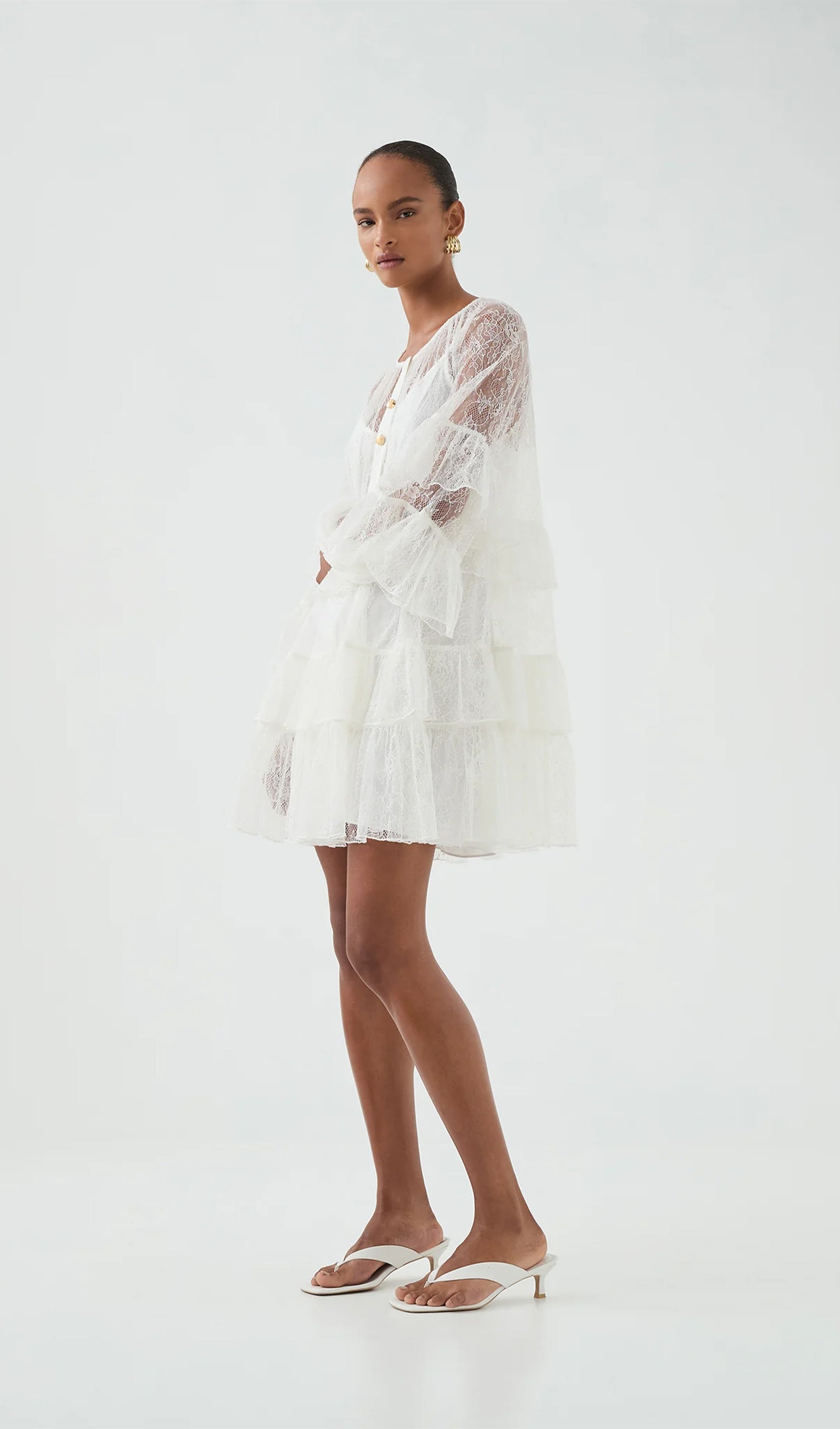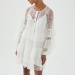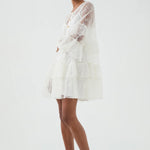 Tõsta oma õhturiietus rafineeritud kihilise pitsilise mini kleidiga valges. See kleit on hoolikalt valmistatud õrnade pitsidetailide ja voogavate kihiliste ruffle'itega, mis loovad dünaamilise liikumise ja tekstuuri.