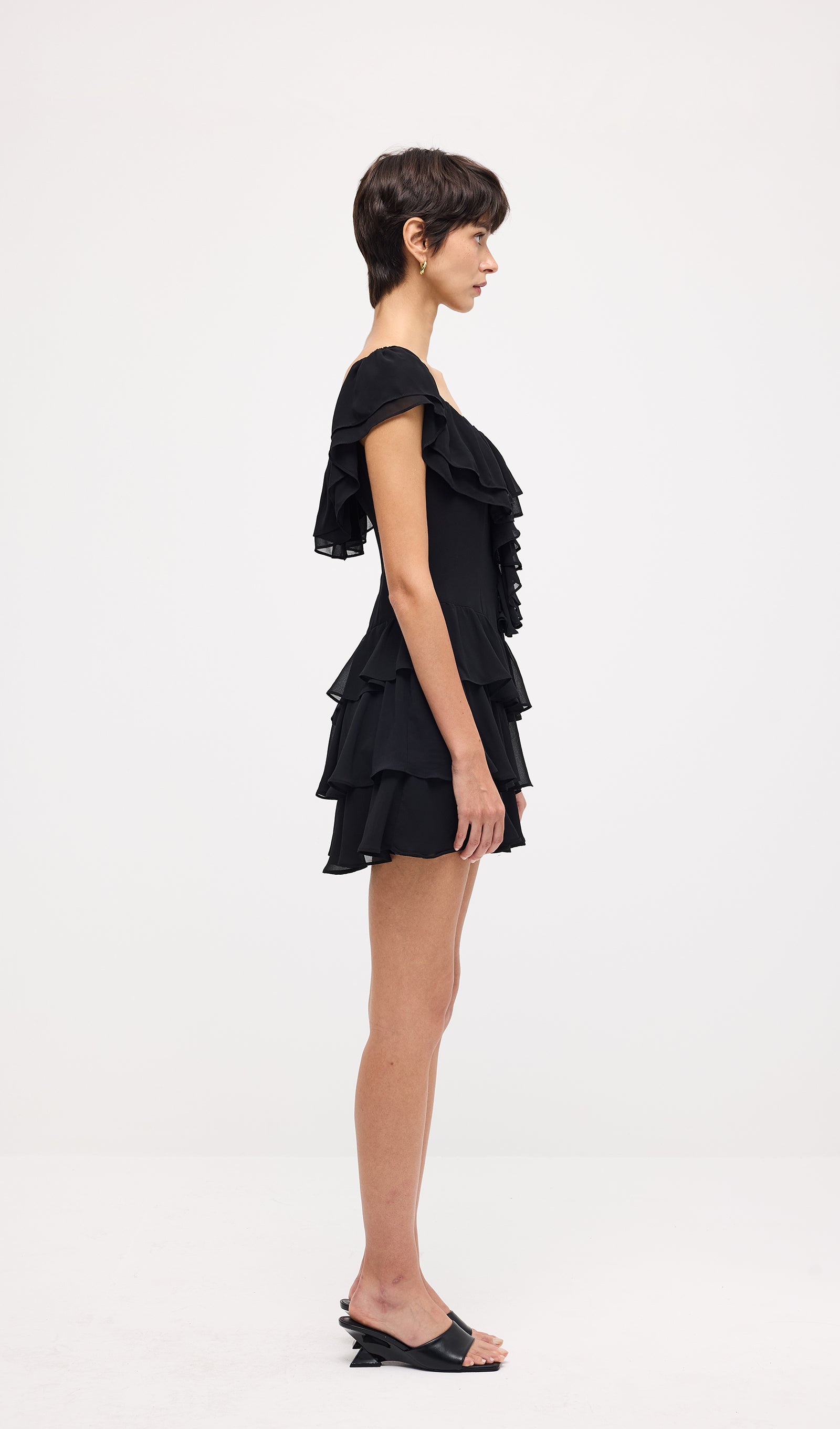 Avasta meie varrukateta rüüsitud kihtidega mini kleit, mis ühendab endas delikaatsed detailid ja meeldiva silueti. Kihilised elemendid loovad õrna mahu ja liikumise, samas kui rüüsitud aktsendid lisavad rafineeritud, naiseliku puudutuse.