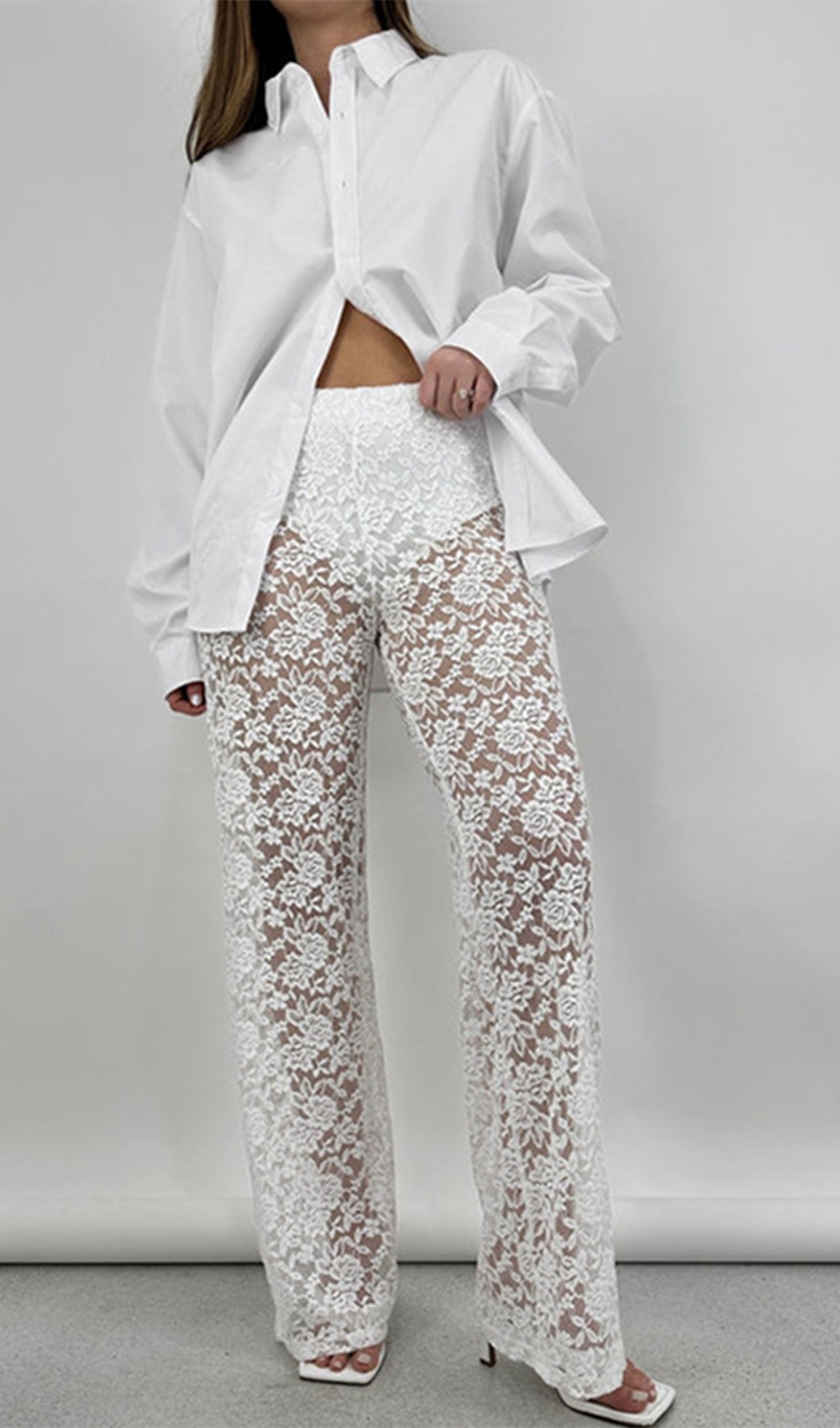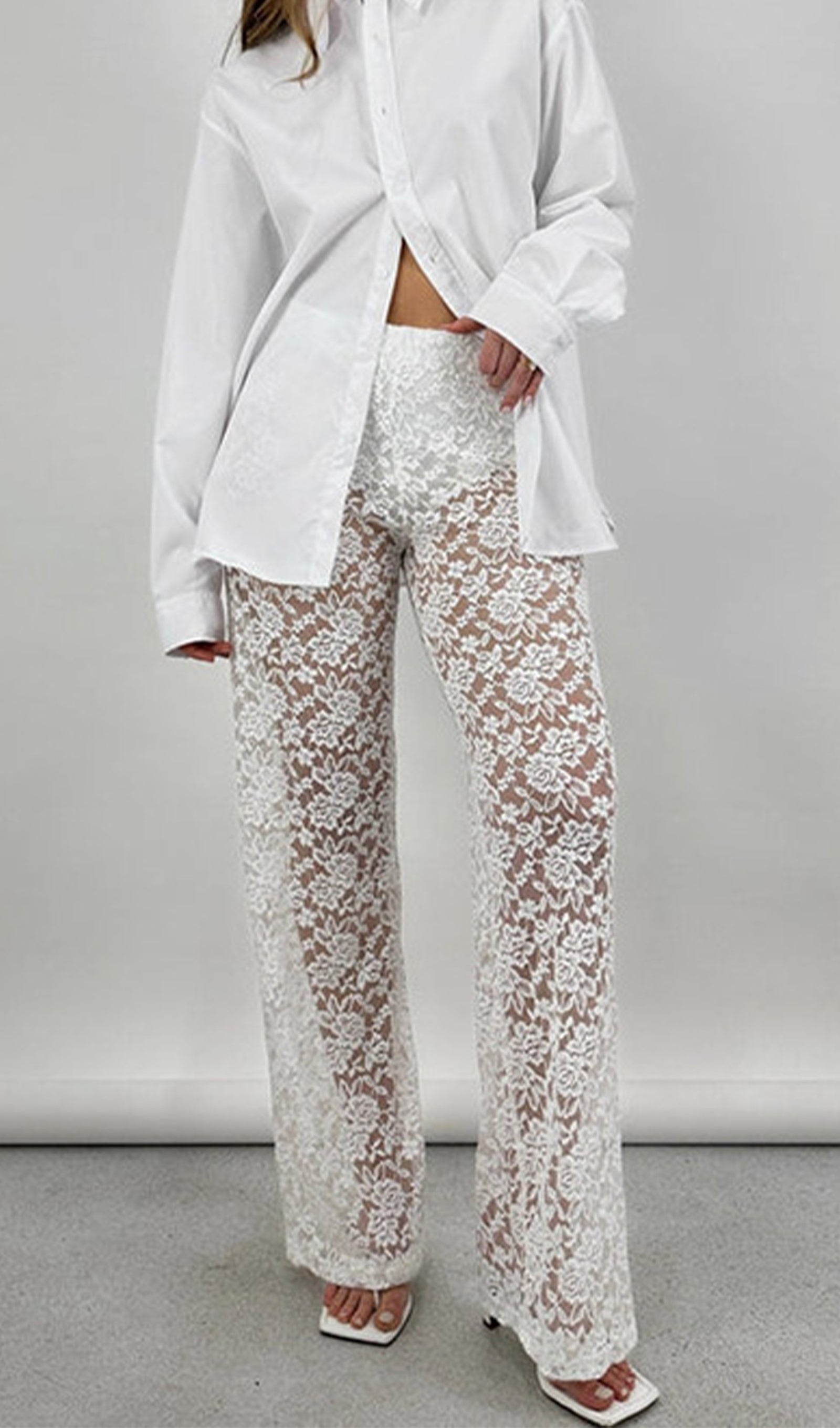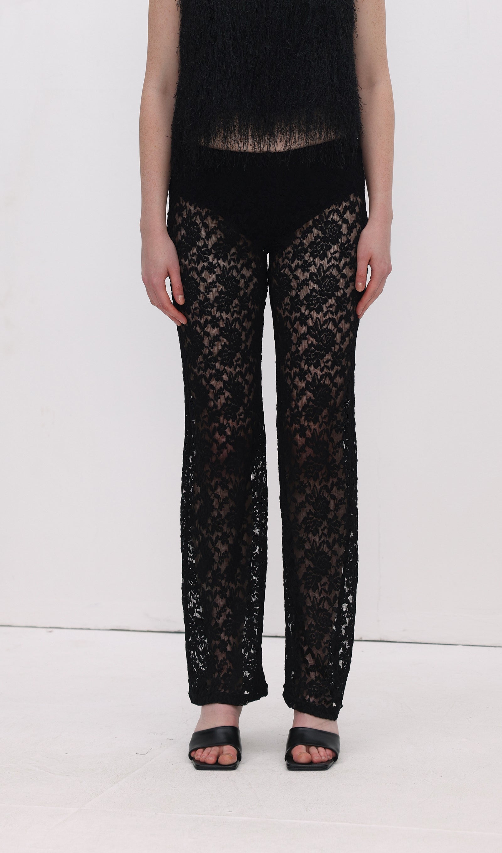Avasta meie täispikkade, laia säärega püksid, mis on valmistatud läbipaistvast pitsist. Kerge puuvillane vooder tagab mugava katvuse, samas kui kujundatud esivöökoht ja elastne tagumine osa pakuvad ideaalset sobivust. Tõsta oma stiili ja mugavust!