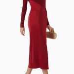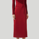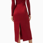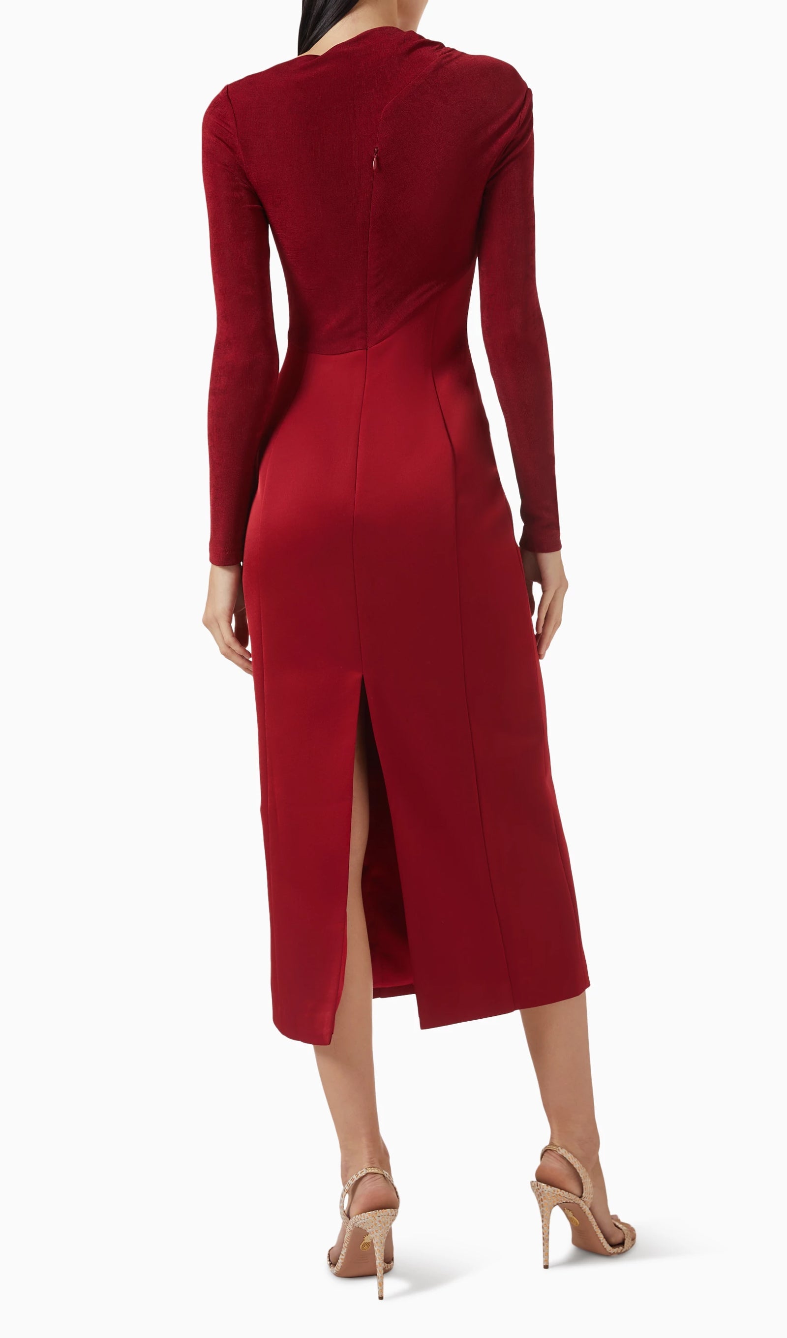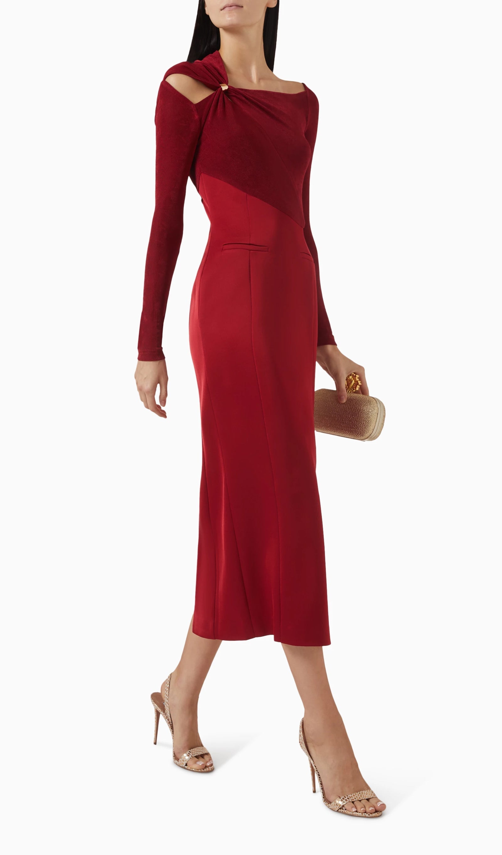 Asümmeetriline kaelusega pikkade varrukatega midi kleit punases