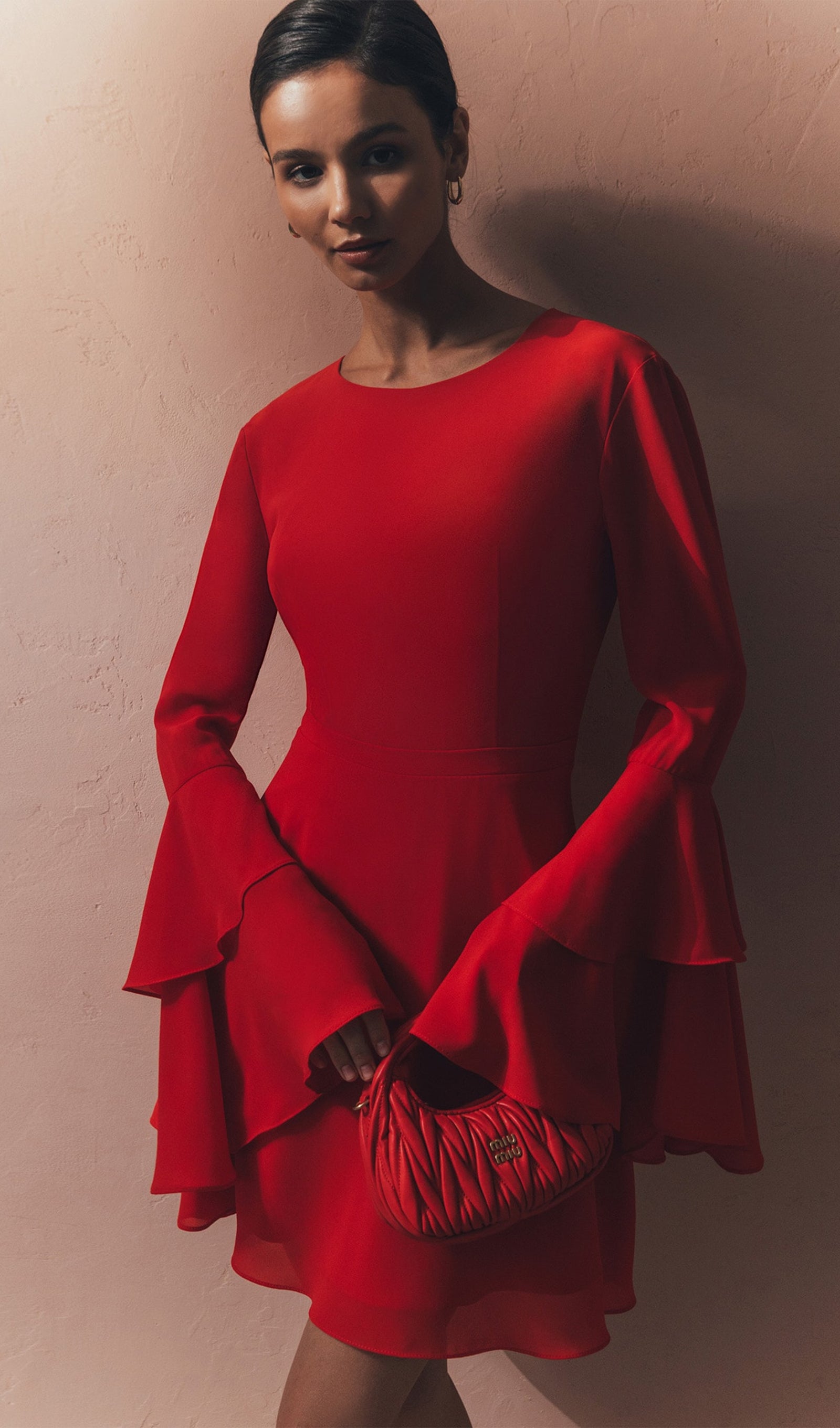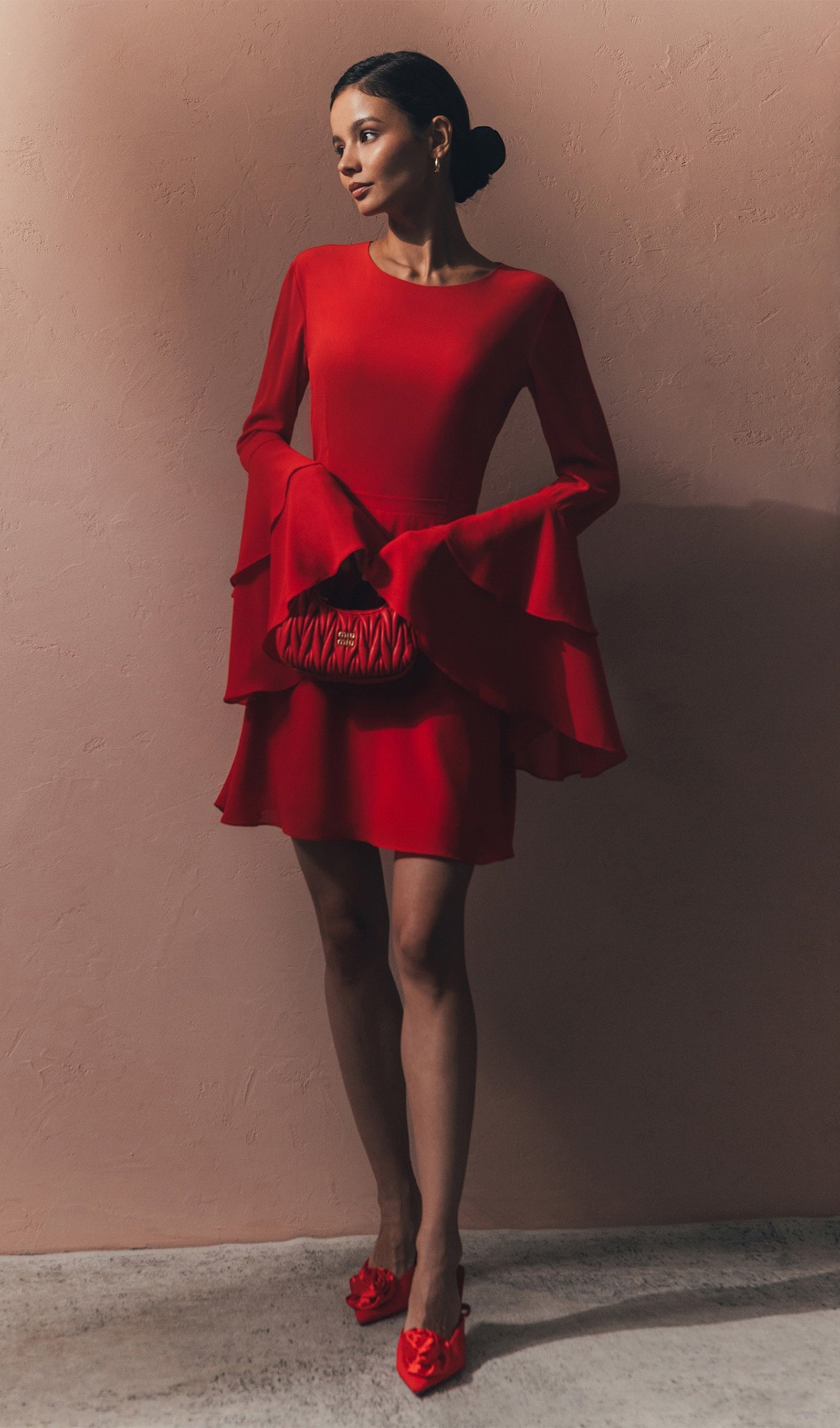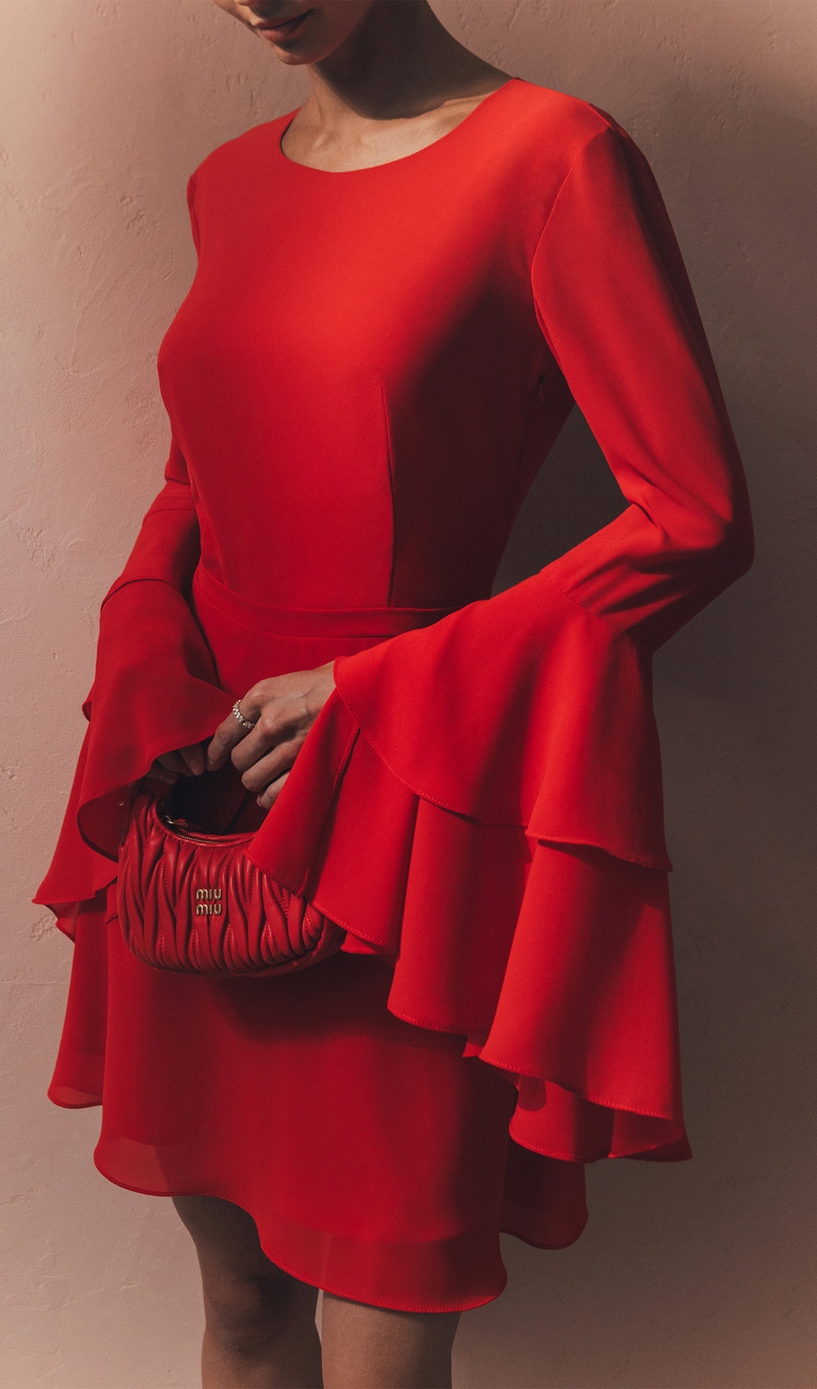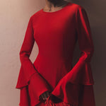 • Ümmargune kaelus ja pikad varrukad volangide mansettidega