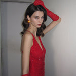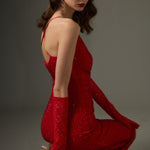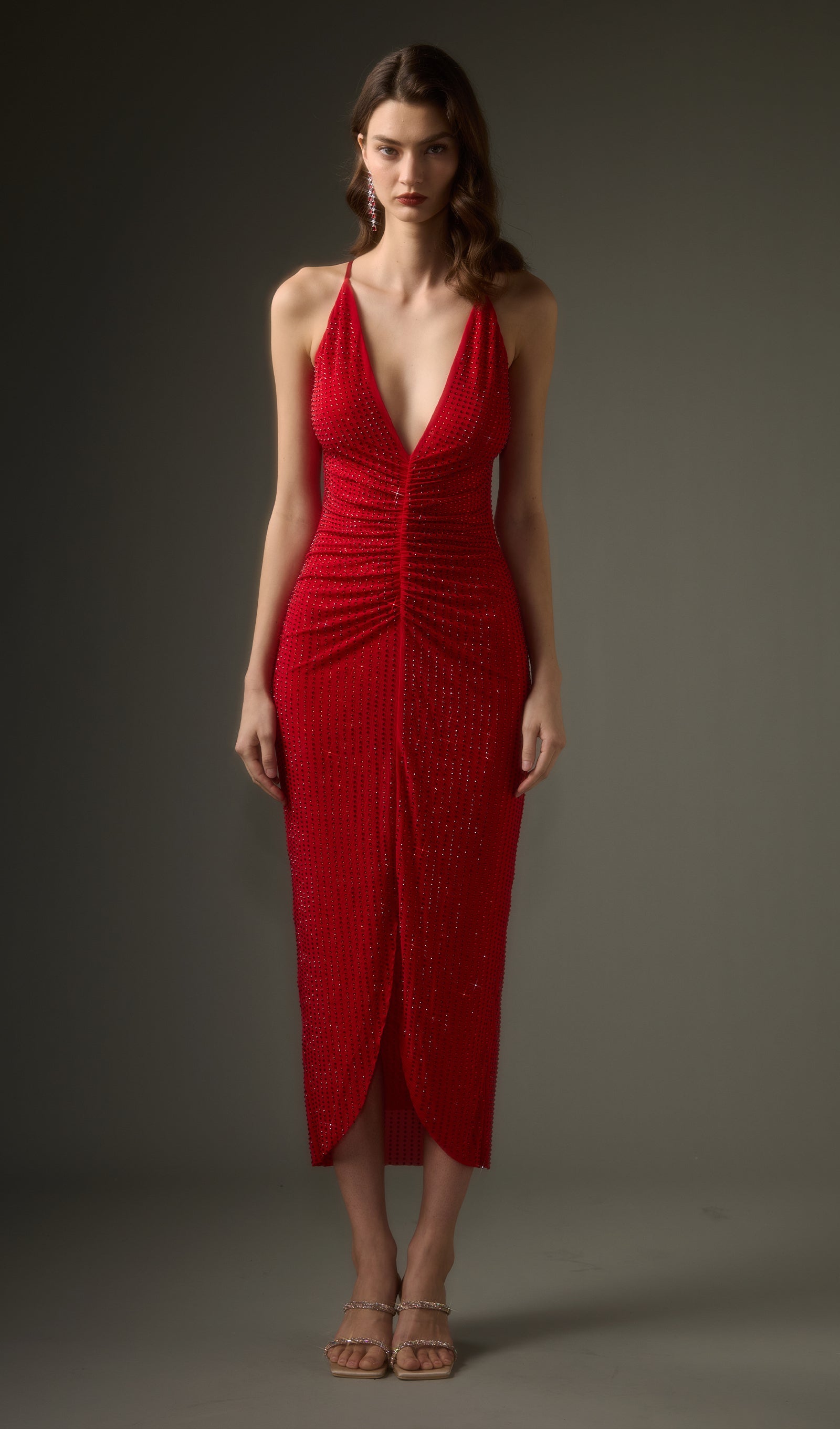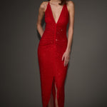 Avasta meie midi kleit, mis on kaunistatud säravate diamante'idega, et täiendada kerget kangast. Sellel kleidil on sügav V-kaelus ja mugavad reguleeritavad rihmad, mis loovad silmapaistva risttaguste detaili. Ruching detail pingutab vöökohta, pakkudes kaunist siluetti.