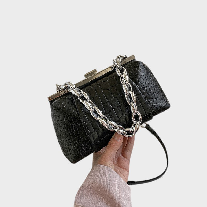 Krokodillitekstuuri ja tugeva struktuuriga, see kott ühendab elegantsi ja isikupära ühes aksessuaaris. Selle klassikaline metallist lukustus ja robustne kettkäepide loovad kaasaegse ja silmapaistva kontrasti. See on ideaalne neile, kes otsivad kompaktset, praktilist tükki tugeva kohalolekuga, olgu see siis päevaks või ööks.