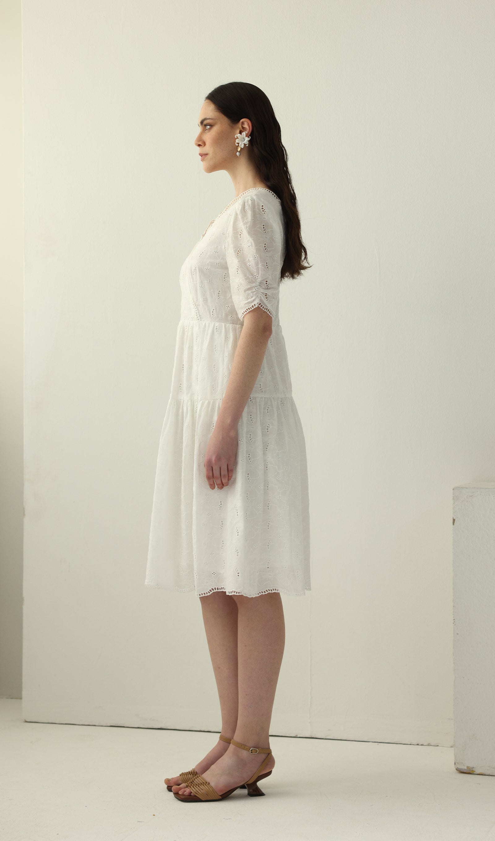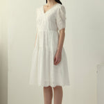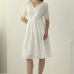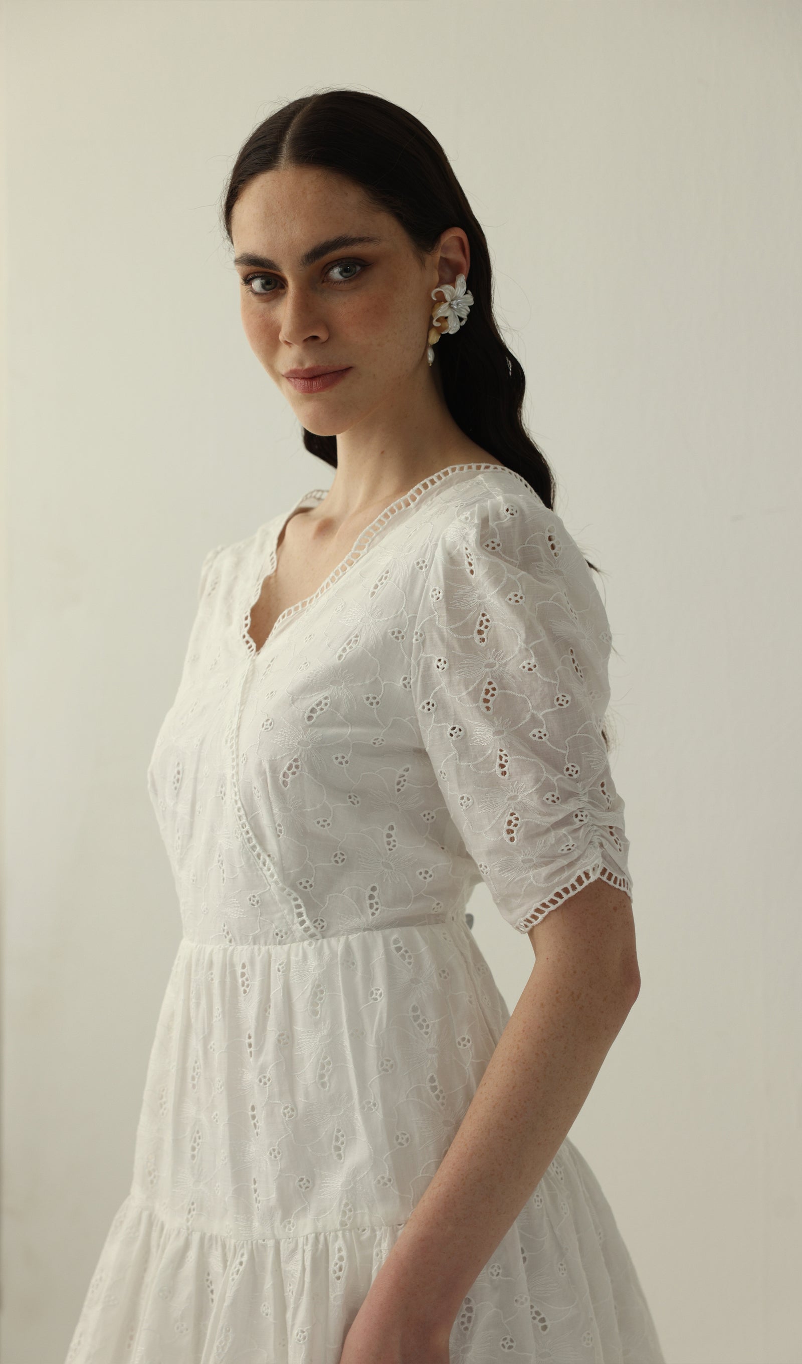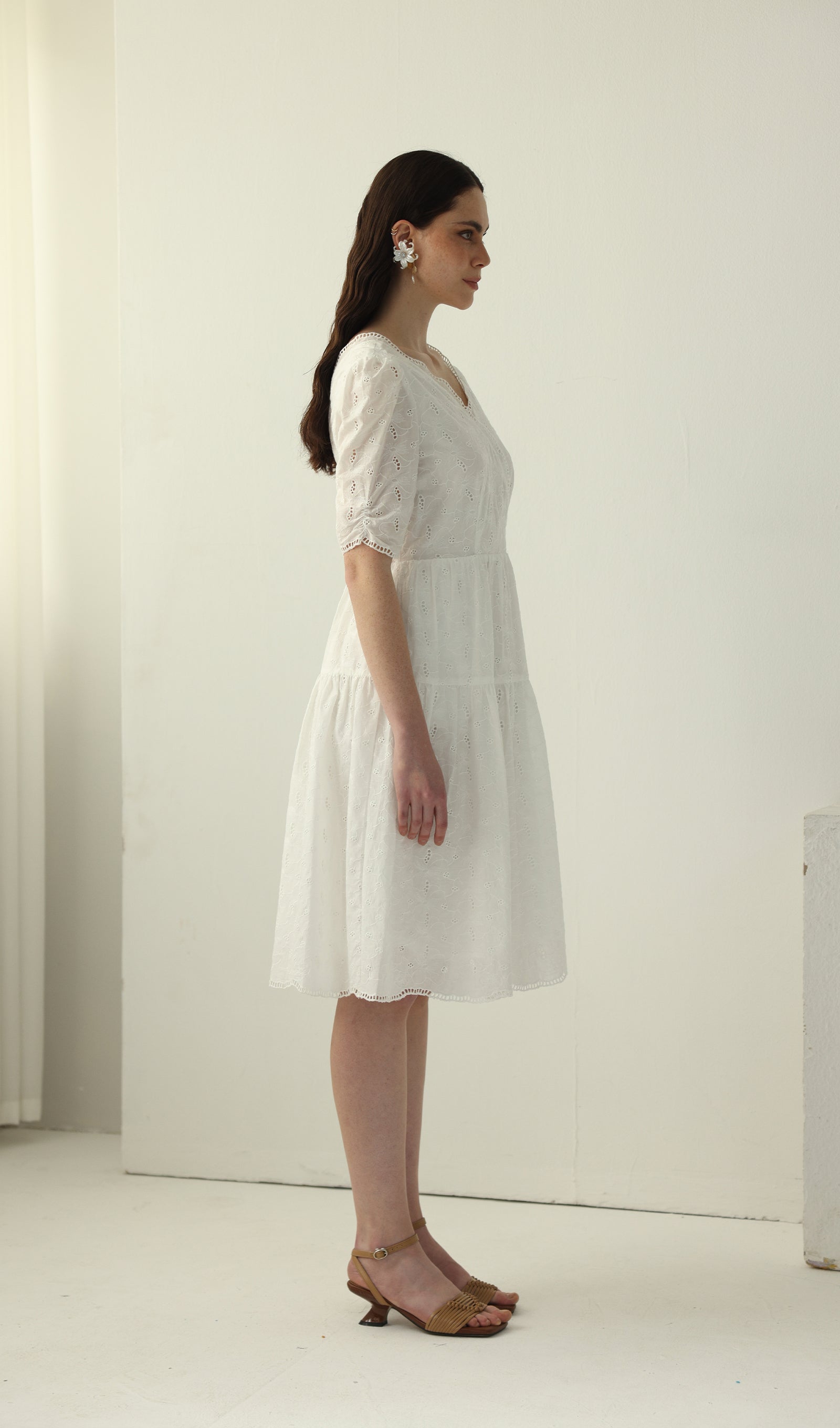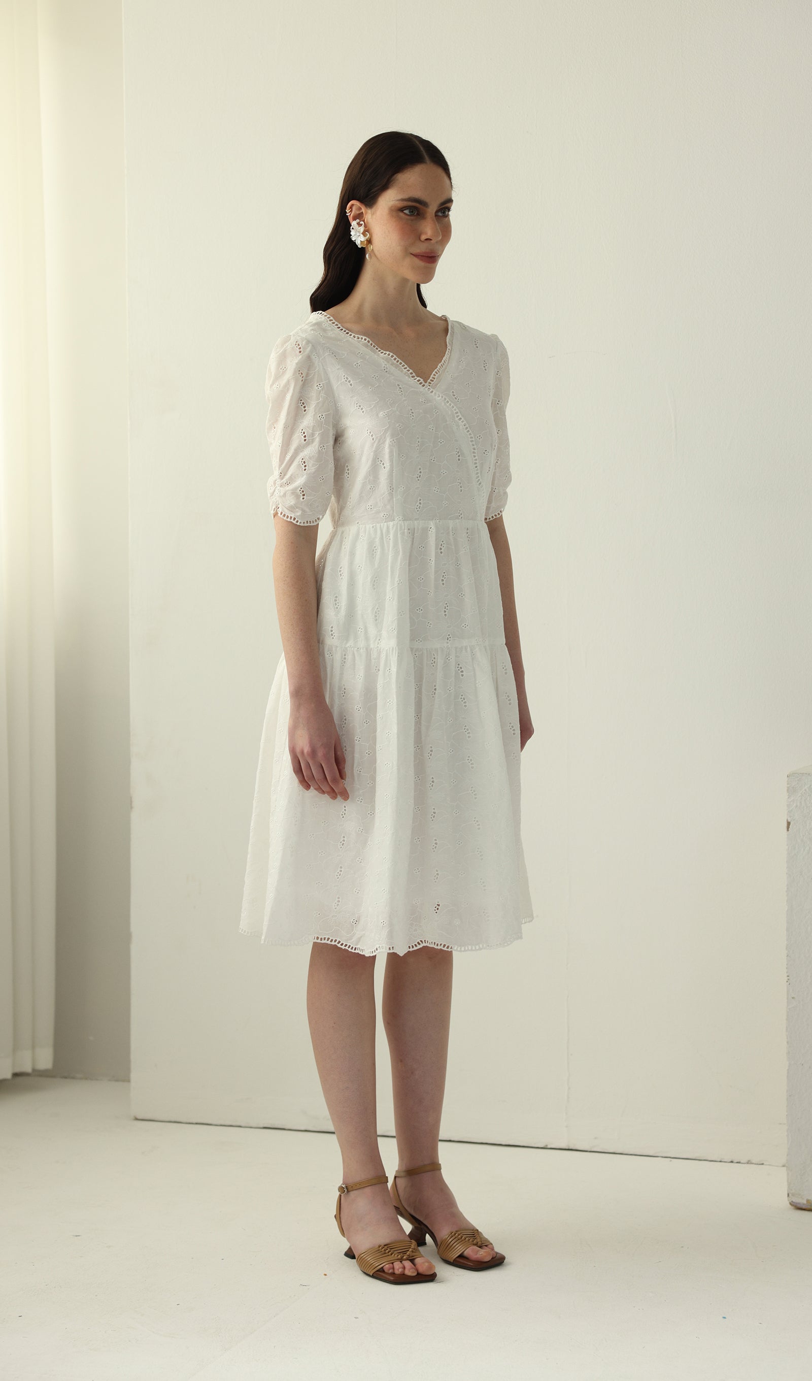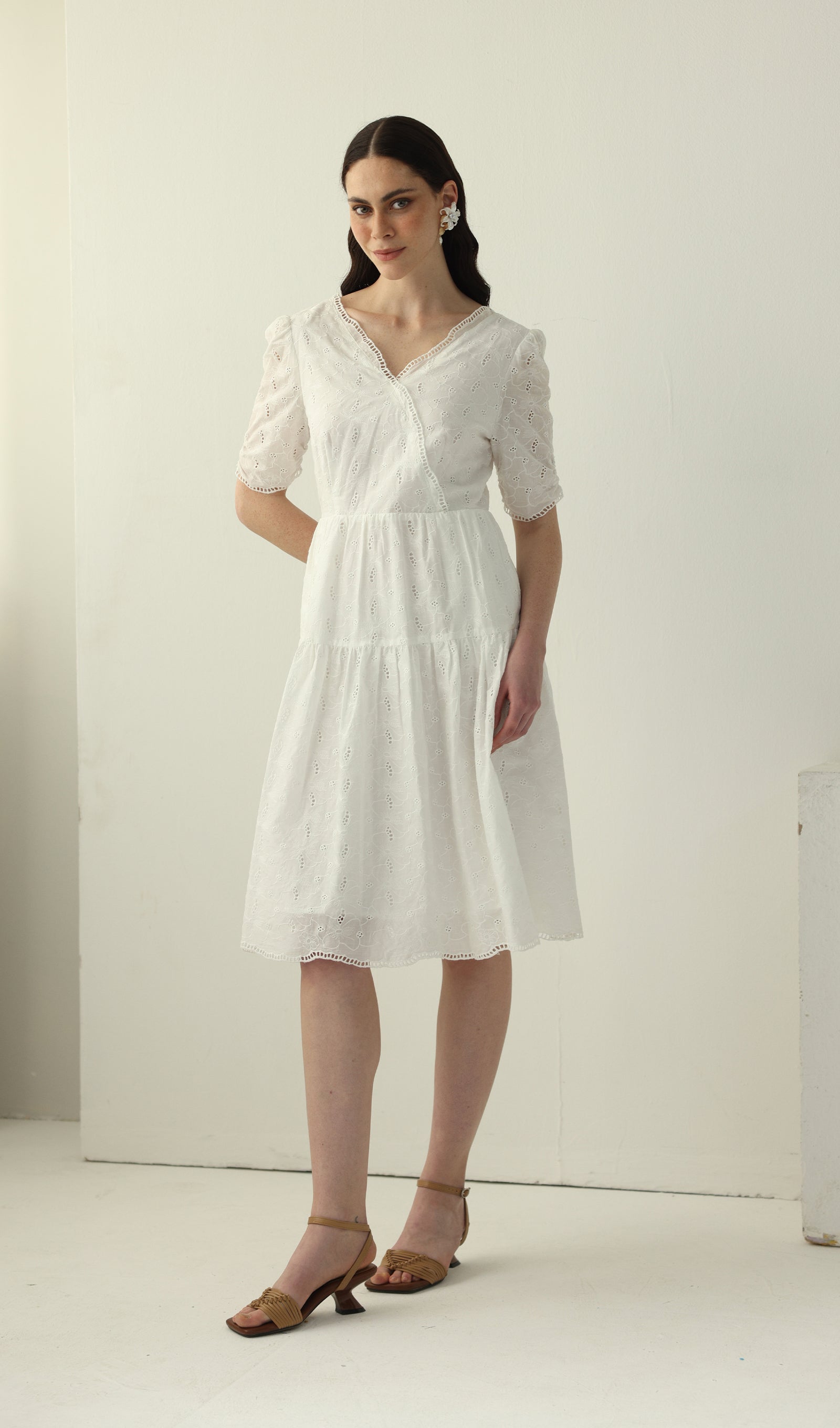 See šikk valge V-kaelusega midi kleit sobib igaks juhuks. Lühikesed varrukad pakuvad mugavust ja mitmekesisust, muutes selle suurepäraseks valikuks nii päevaseks väljasõiduks kui ka ametlikeks üritusteks. Valmistatud 100% puuvillast, hoiab see kleit sind stiilsena ja enesekindlana.