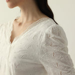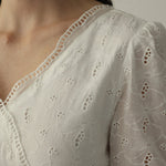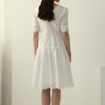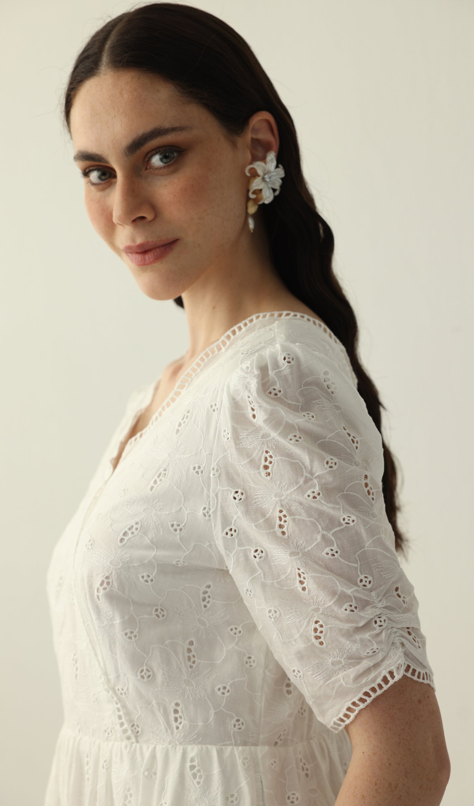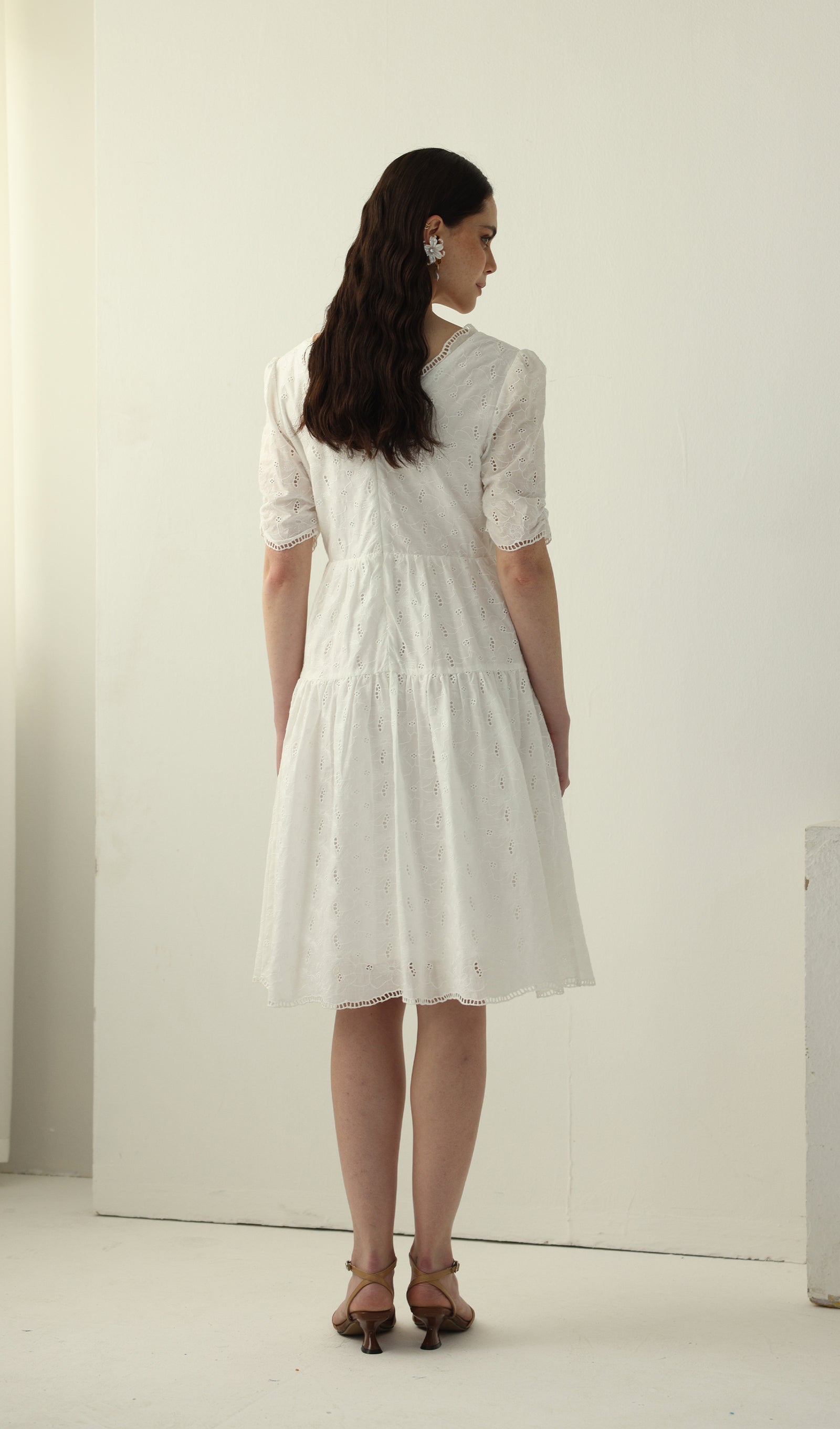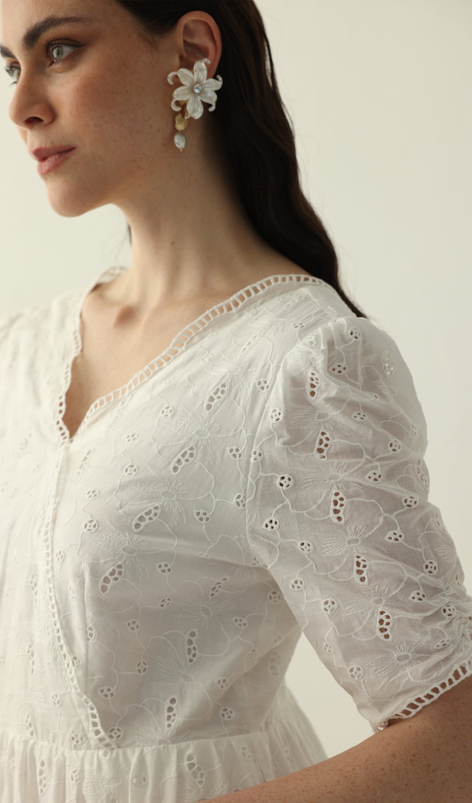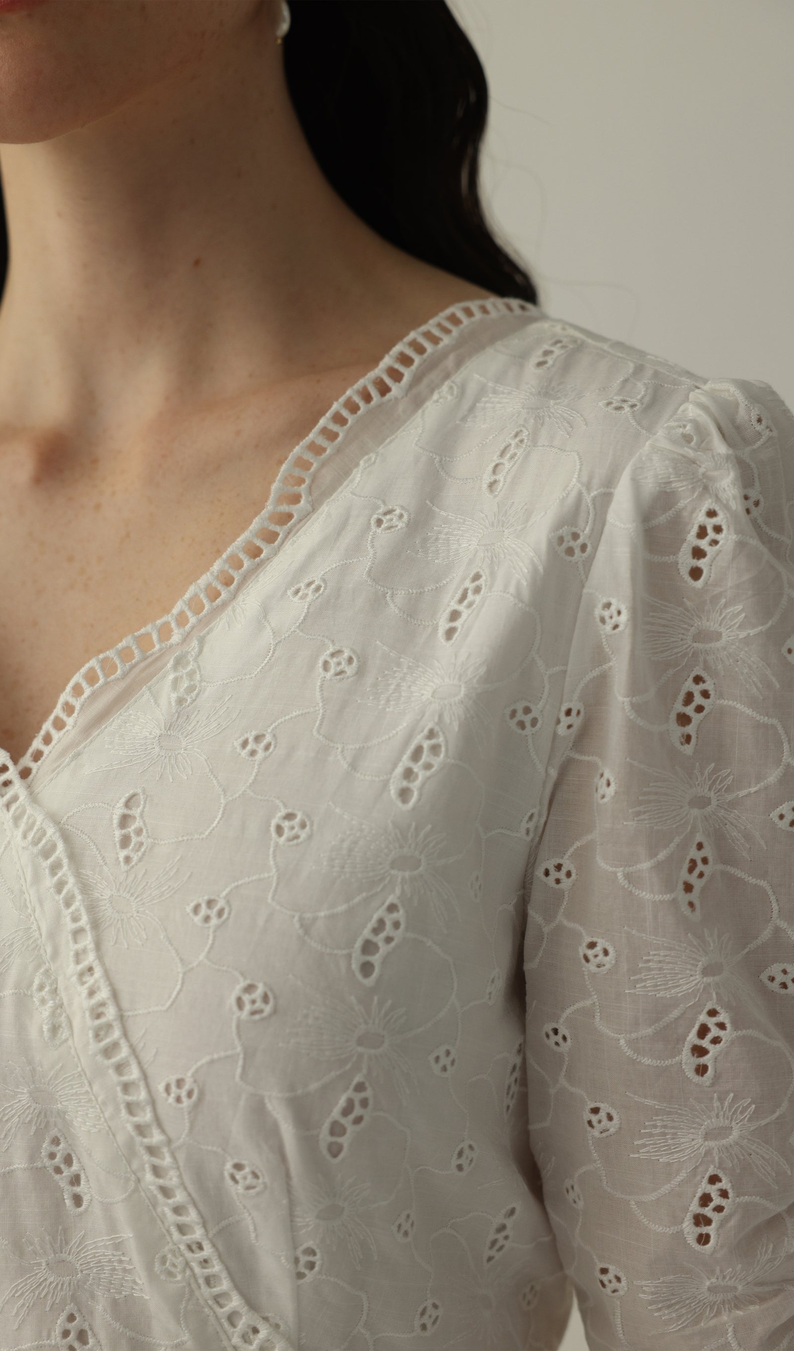 See šikk valge V-kaelusega midi kleit sobib igaks juhuks. Lühikesed varrukad pakuvad mugavust ja mitmekesisust, muutes selle suurepäraseks valikuks nii päevaseks väljasõiduks kui ka ametlikeks üritusteks. Valmistatud 100% puuvillast, hoiab see kleit sind stiilsena ja enesekindlana.