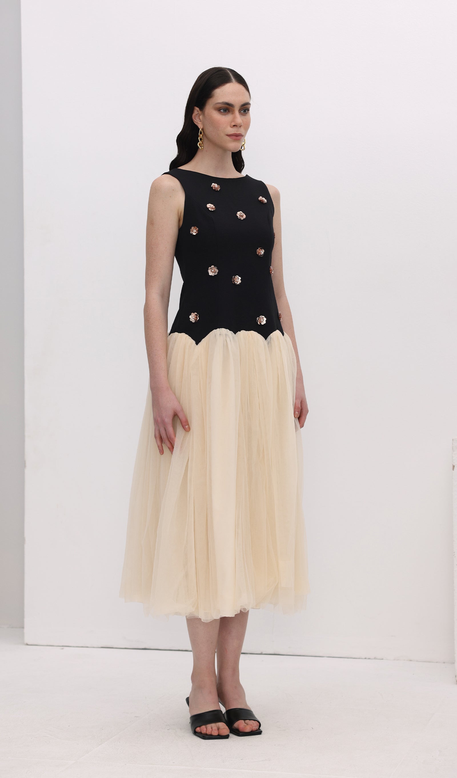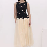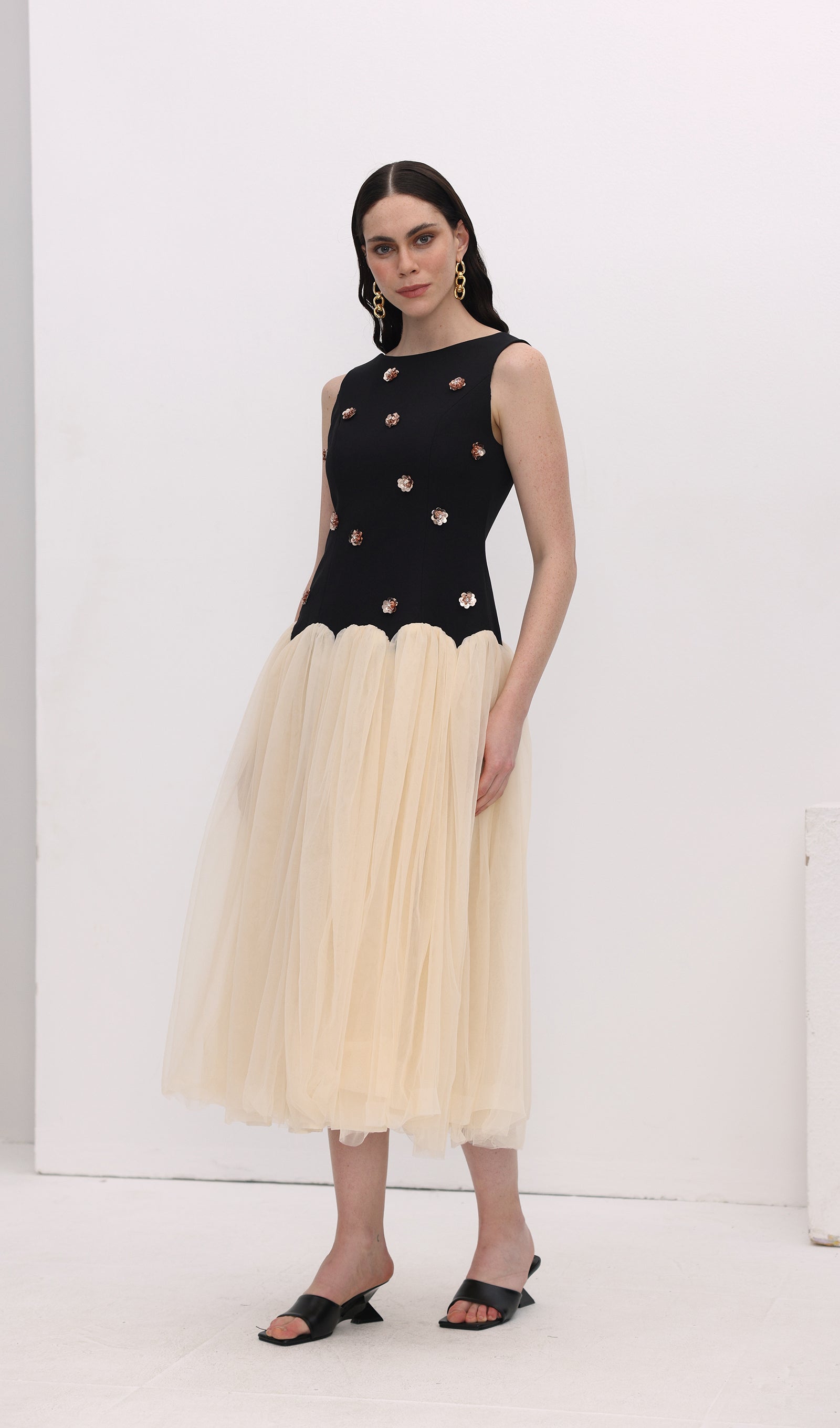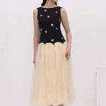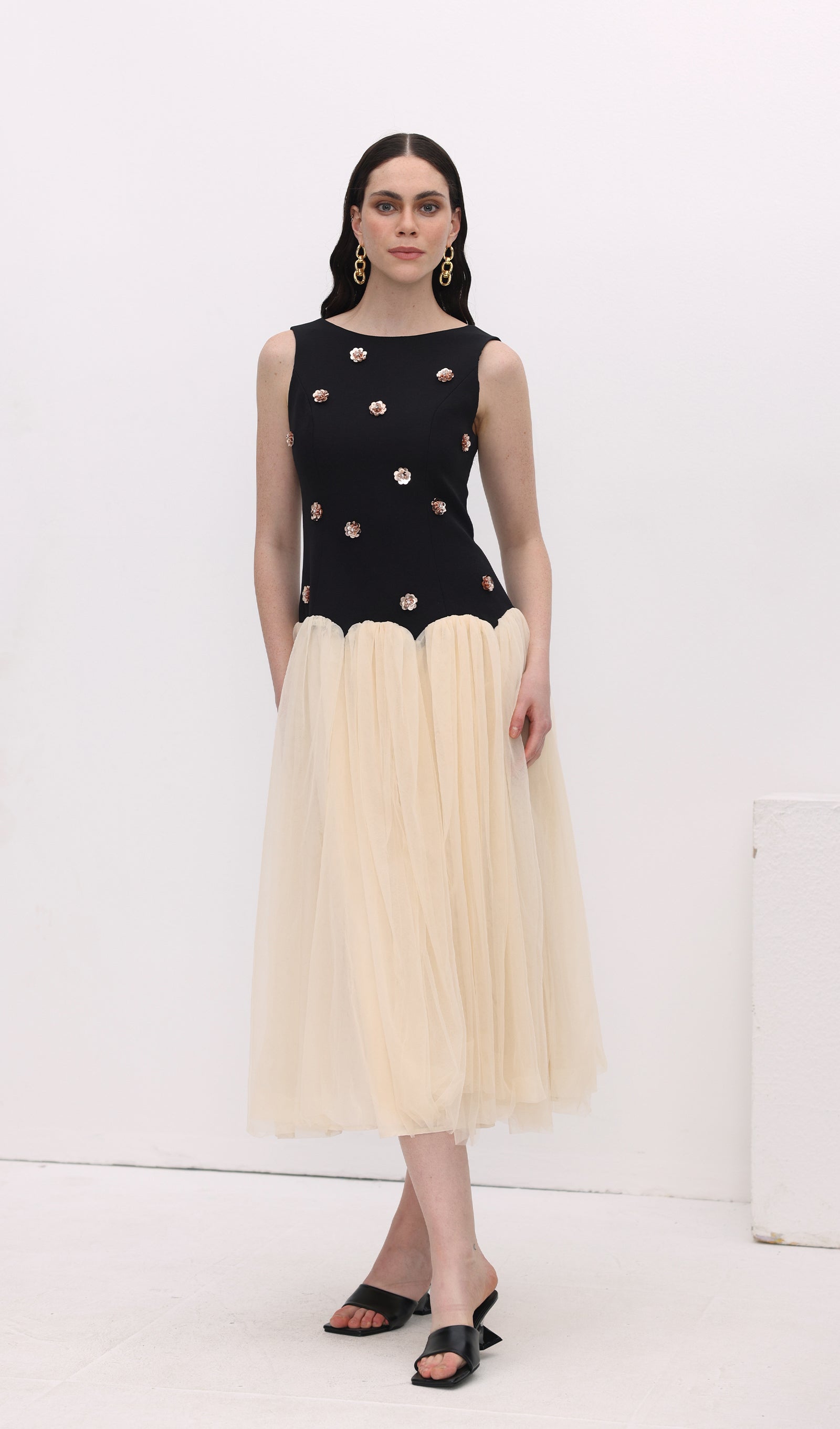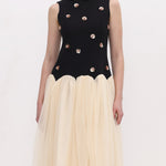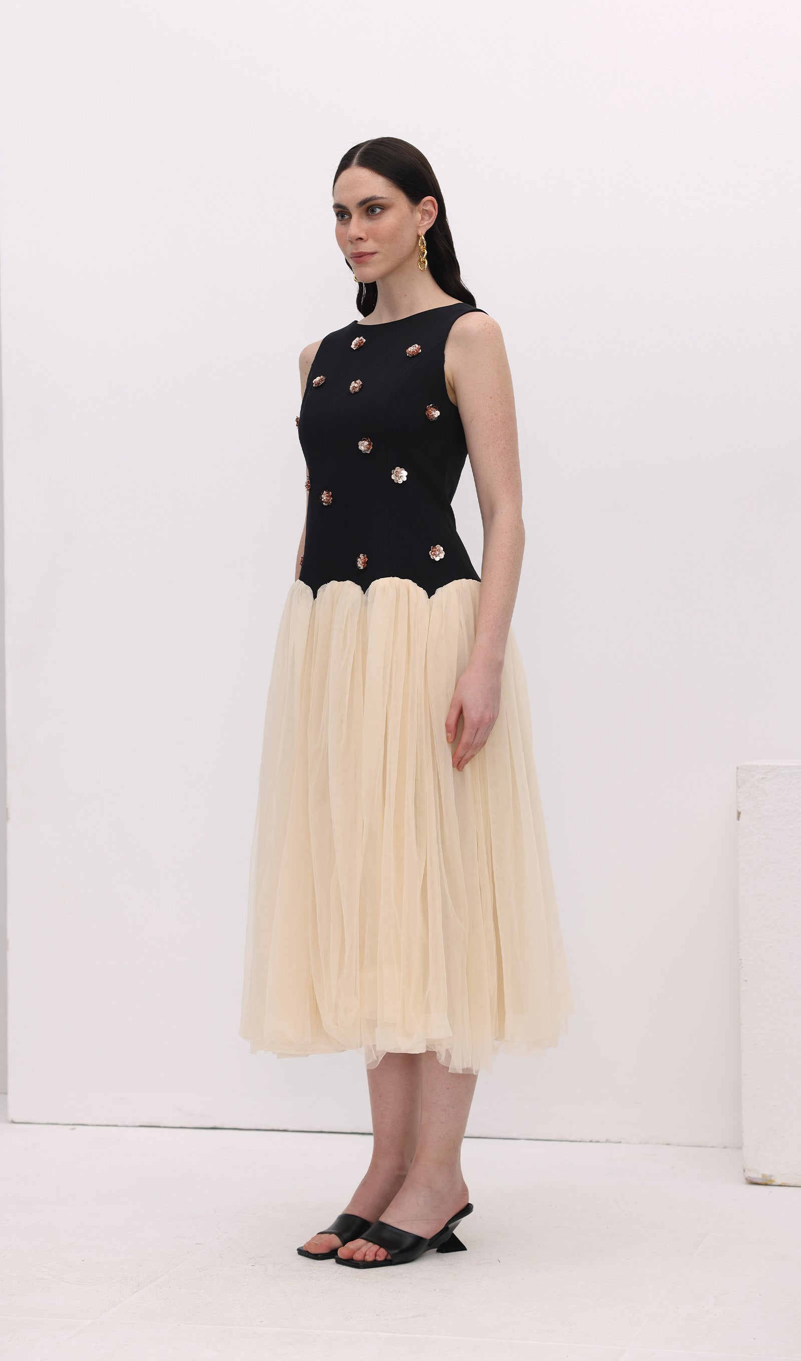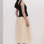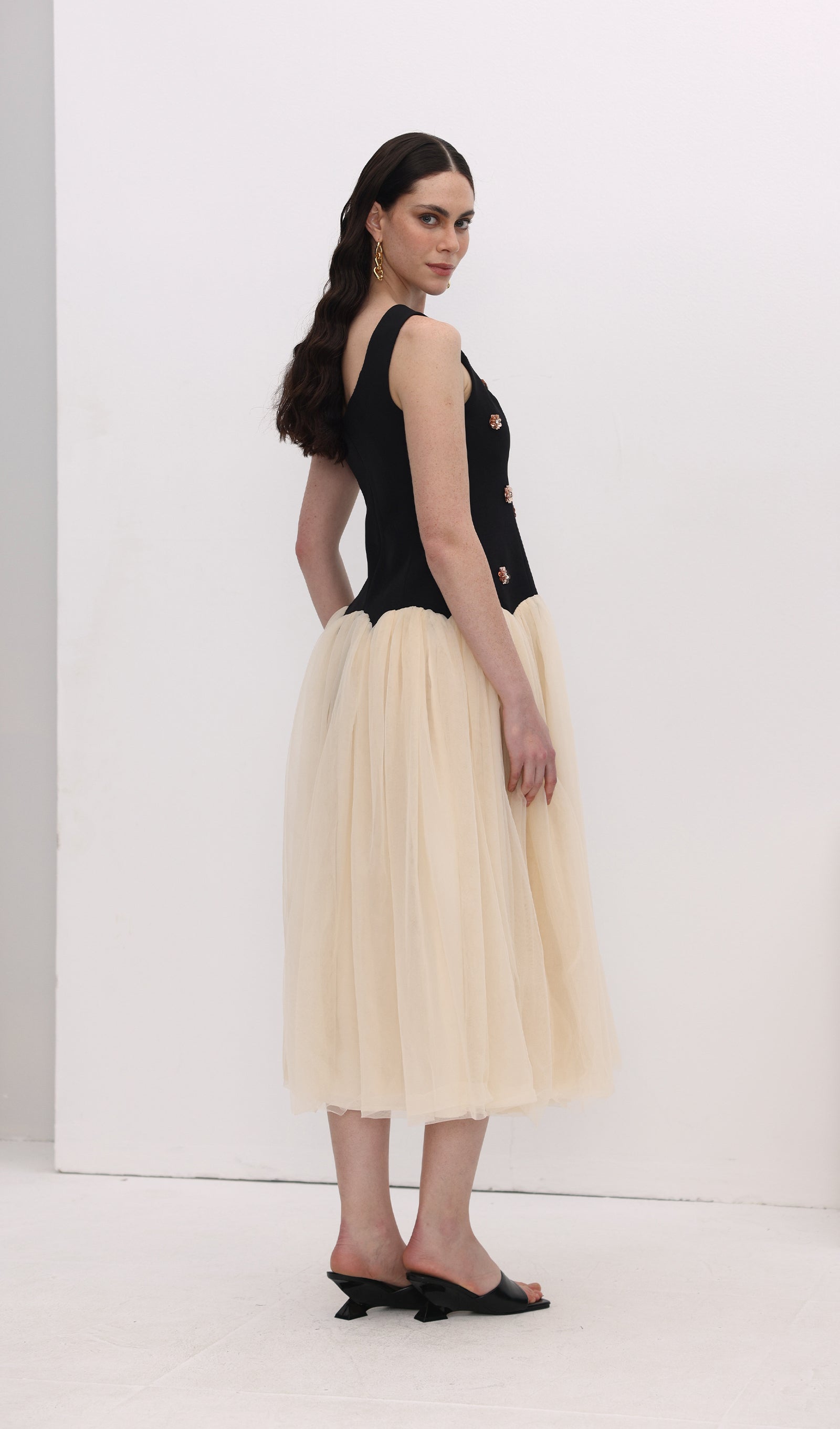 Kleit sisaldab korsetti stiilis ülemist osa, mis rõhutab vööd ja loob silmatorkavalt struktureeritud silueti. Sakiliste äärtega pleedi tülli seelik lisab eeterlikku elegantsi, muutes selle kleidi sobivaks nii kontorisse kui ka õhtustele üritustele. Kombineeri stiilsete kontsade ja minimaalsete aksessuaaridega, et saavutada täiuslik välimus.