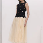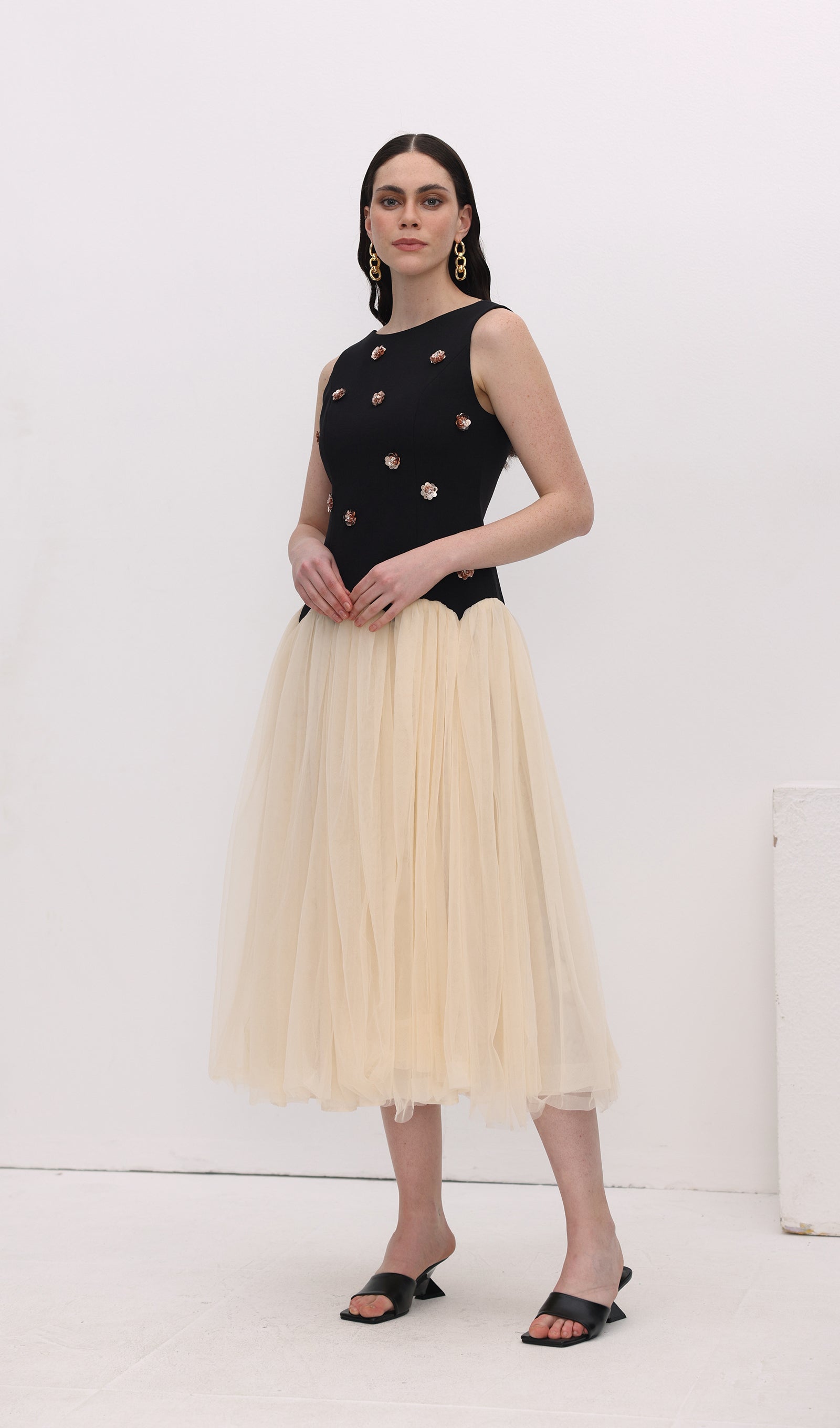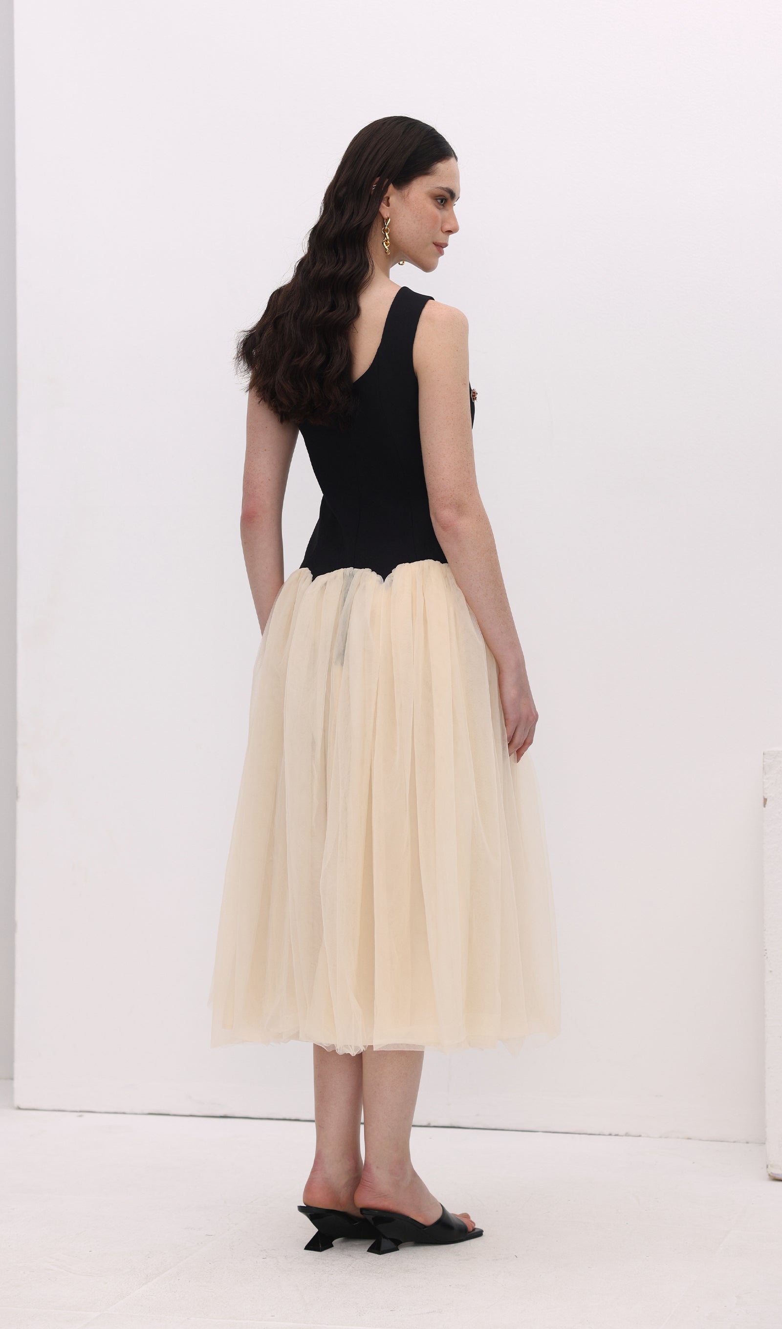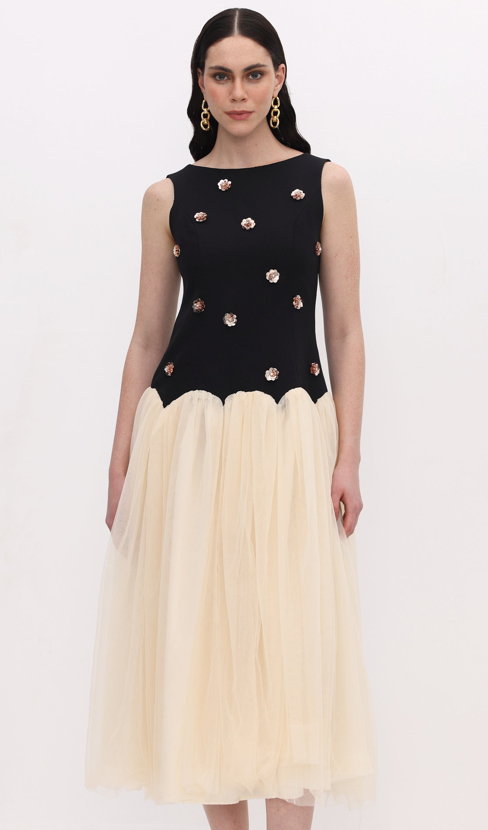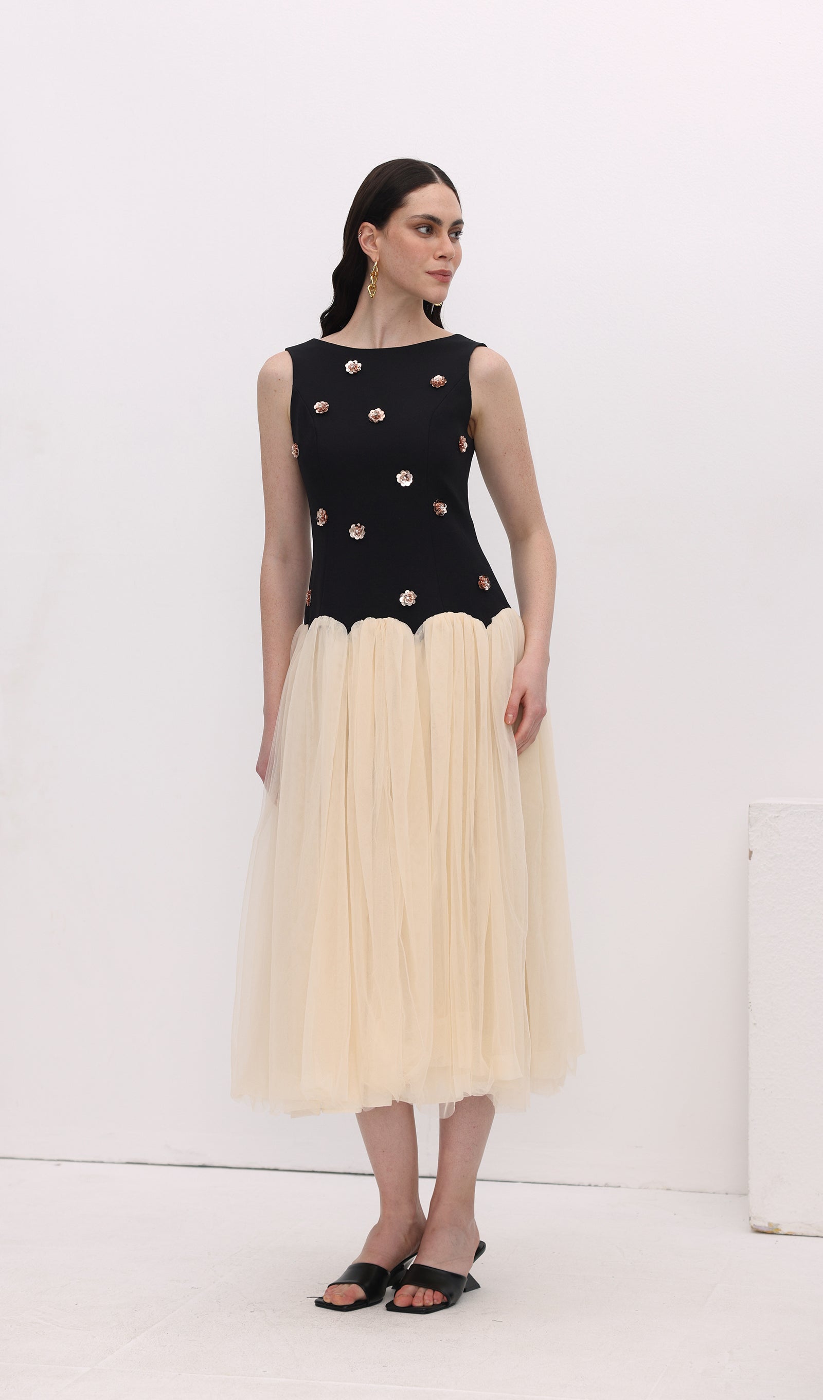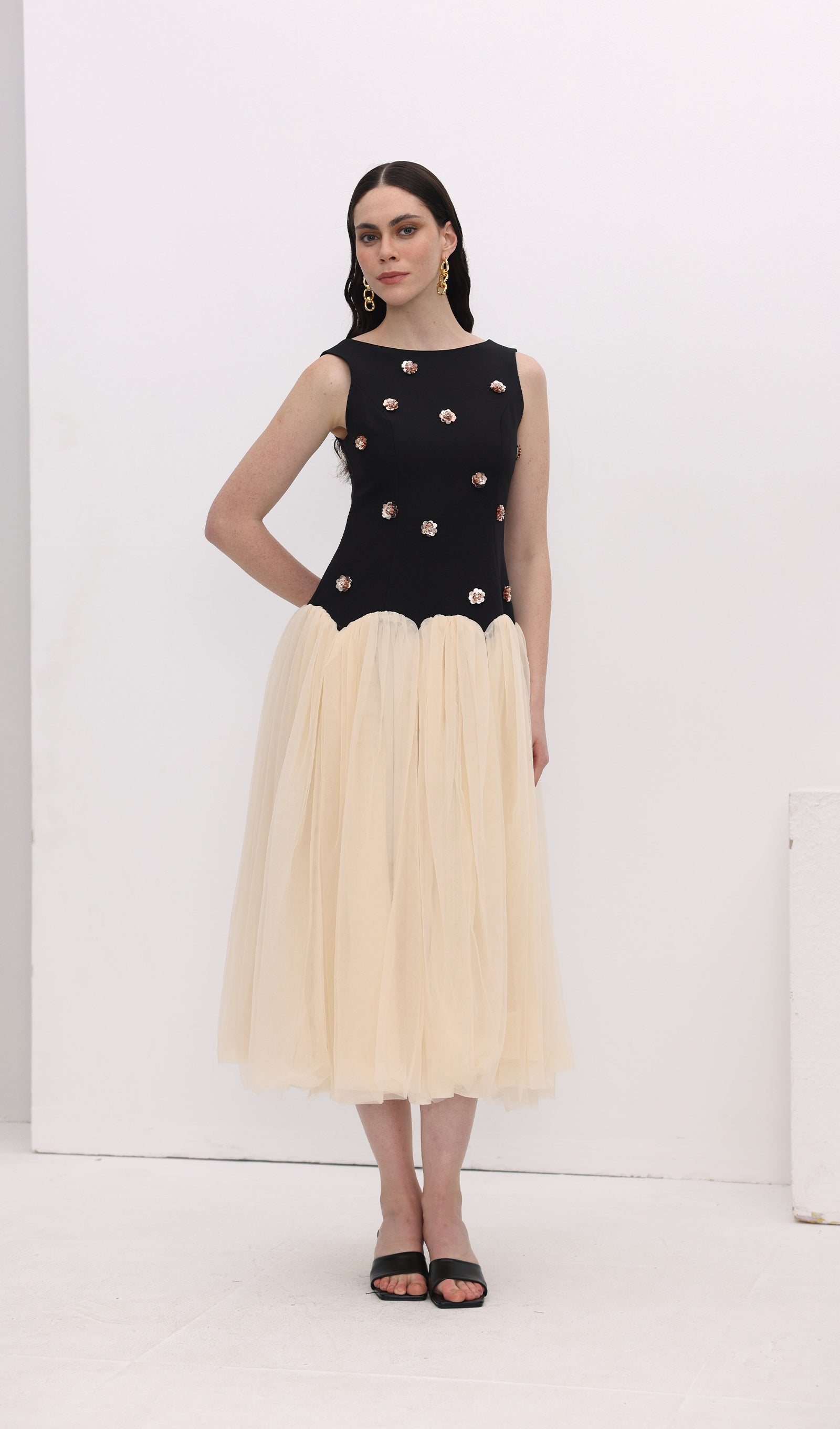 Kleit sisaldab korsetti stiilis ülemist osa, mis rõhutab vööd ja loob silmatorkavalt struktureeritud silueti. Sakiliste äärtega pleedi tülli seelik lisab eeterlikku elegantsi, muutes selle kleidi sobivaks nii kontorisse kui ka õhtustele üritustele. Kombineeri stiilsete kontsade ja minimaalsete aksessuaaridega, et saavutada täiuslik välimus.